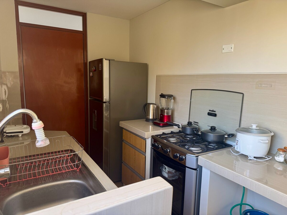 Wenn du nach Chiclayo zur Arbeit, Gesundheit oder Urlaub kommst, allein oder mit deiner Familie, bieten wir dir eine geräumige Wohnung, super hell und voll möbliert in zentraler Lage in Chiclayo mit Kapazität für 6 Personen, in der Nähe von Einkaufszentren und Restaurants, unser Airbnb hat zwei geräumige Zimmer, ausgestattete Küche, gemütliches Esszimmer und einen idealen Grill zum Teilen, wir haben alles, was du für einen komfortablen und sicheren Aufenthalt benötigst, buche jetzt und erlebe die beste Erfahrung.