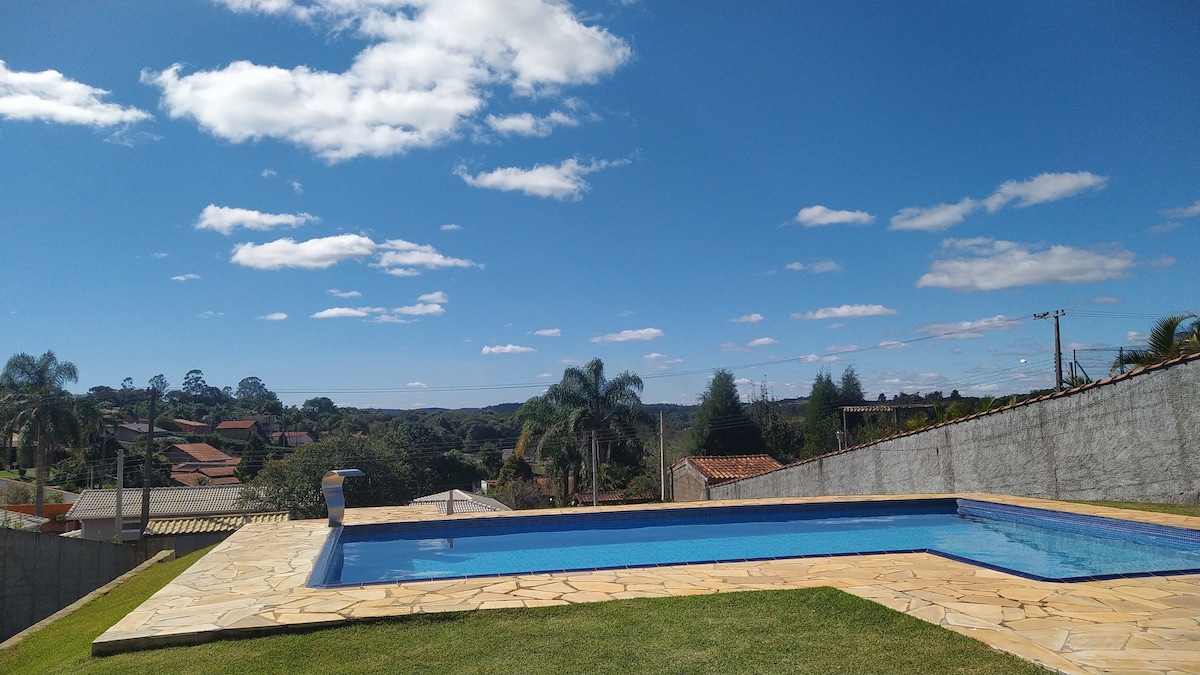 Kennst du diesen Ort, an dem du bei geöffnetem Fenster schlafen kannst, den Autoschlüssel im Kontakt? Hier ist der richtige Ort, Haustiere sind super willkommen. Entspanne dich mit der ganzen Familie in diesem ruhigen, sicheren und einladenden Haus absolute Stille, Integration in die Natur, ökologischer Weg und Wasserfall auf dem Grundstück, kleiner, voll privater Pool. 25 Minuten von den städtischen Zentren, 21 km Shopping Iguatemi entfernt. In der Kälte gibt es Kamine, um dich aufzuwärmen, und in der Hitze einen Pool, um dich abzukühlen.