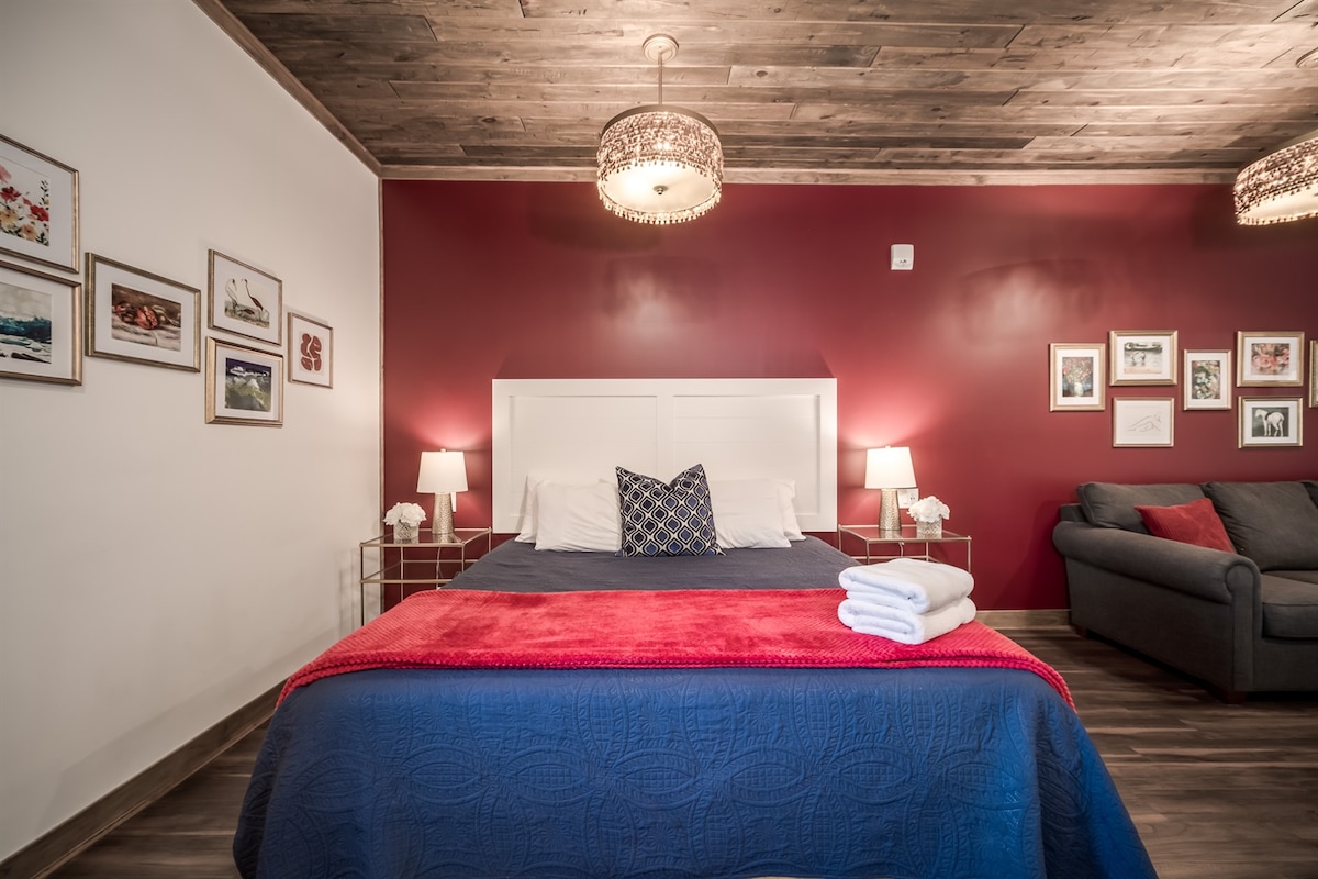 Romantischer Rückzugsort am Fluss Die Mississippi Suite ist für Paare konzipiert, die es ruhiger angehen lassen, wieder zueinander finden und sich stilvoll entspannen möchten. Mit einem gemütlichen Kingsize-Bett, sanfter Beleuchtung und einem flackernden elektrischen Kamin ist es die perfekte Kulisse für einen romantischen Kurzurlaub. Genieße den Morgenkaffee gemeinsam von deiner Kaffeebar auf dem Zimmer oder beende den Abend mit einem ruhigen Film auf dem Smart-TV – nur wenige Schritte von Prescotts charmanter Innenstadt und der malerischen Uferpromenade entfernt.