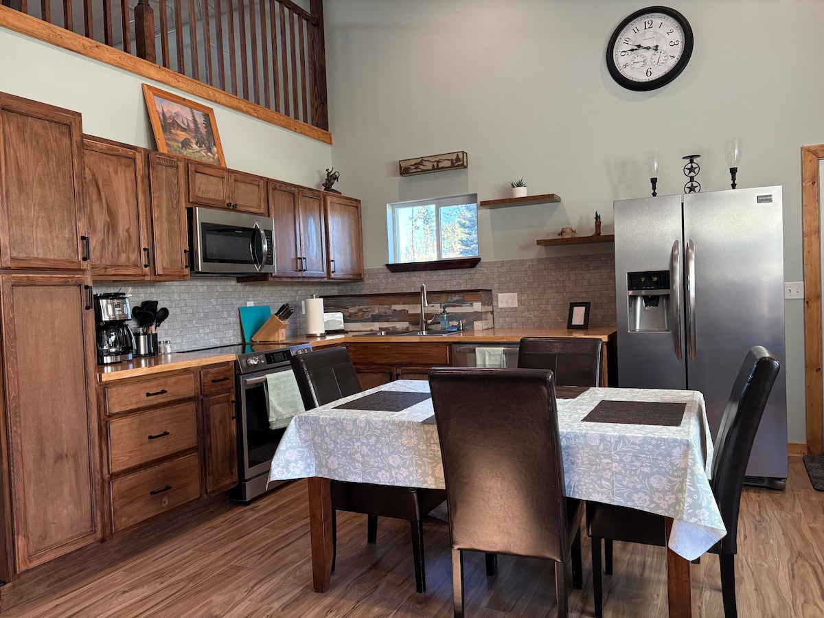 Das Ruby umfasst die südliche Hälfte einer Duplex-Hütte, die sich auf einer aktiven Ranch befindet. Sie verfügt über eine Einheit mit zwei Schlafzimmern, einem Queensize-Bett und passenden Einzelbetten sowie einem Badezimmer mit Dusche und Badewanne. Eine Küchenzeile mit einer Snackbar ermöglicht das Essen vor Ort. Das Wohnzimmer mit einem Sofa und zwei Stühlen blickt auf eine große Terrasse. Ein privater Eingang bietet die Möglichkeit, einen atemberaubenden Panoramablick auf die Berge zu genießen. Die ganze Familie kann sich entspannen und fernsehen, die Tierwelt genießen oder die Ruhe des Flusses hören.