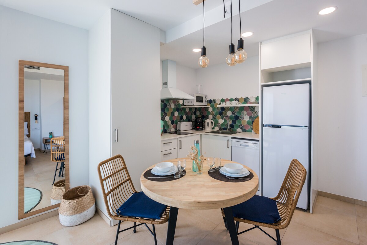 ¡Enamórate de nuevo en nuestro loft vista mar! Podrás ver el mar desde el balcón, mientras despiertas en tu cama o mientras te duchas. Decorado con esmero y con todo lo necesario para que solo os preocupéis el uno del otro. Bamblue Boutique Apartments se encuentra a 500m de la playa, con wifi de alta velocidad, smart TV con chromecast, aire acondicionado, lavavajillas,... Disfruta de tu balcón y las zones comunes: piscina, barbacoa, terraza, solarium,... Tenemos parking (€) bajo reserva previa.