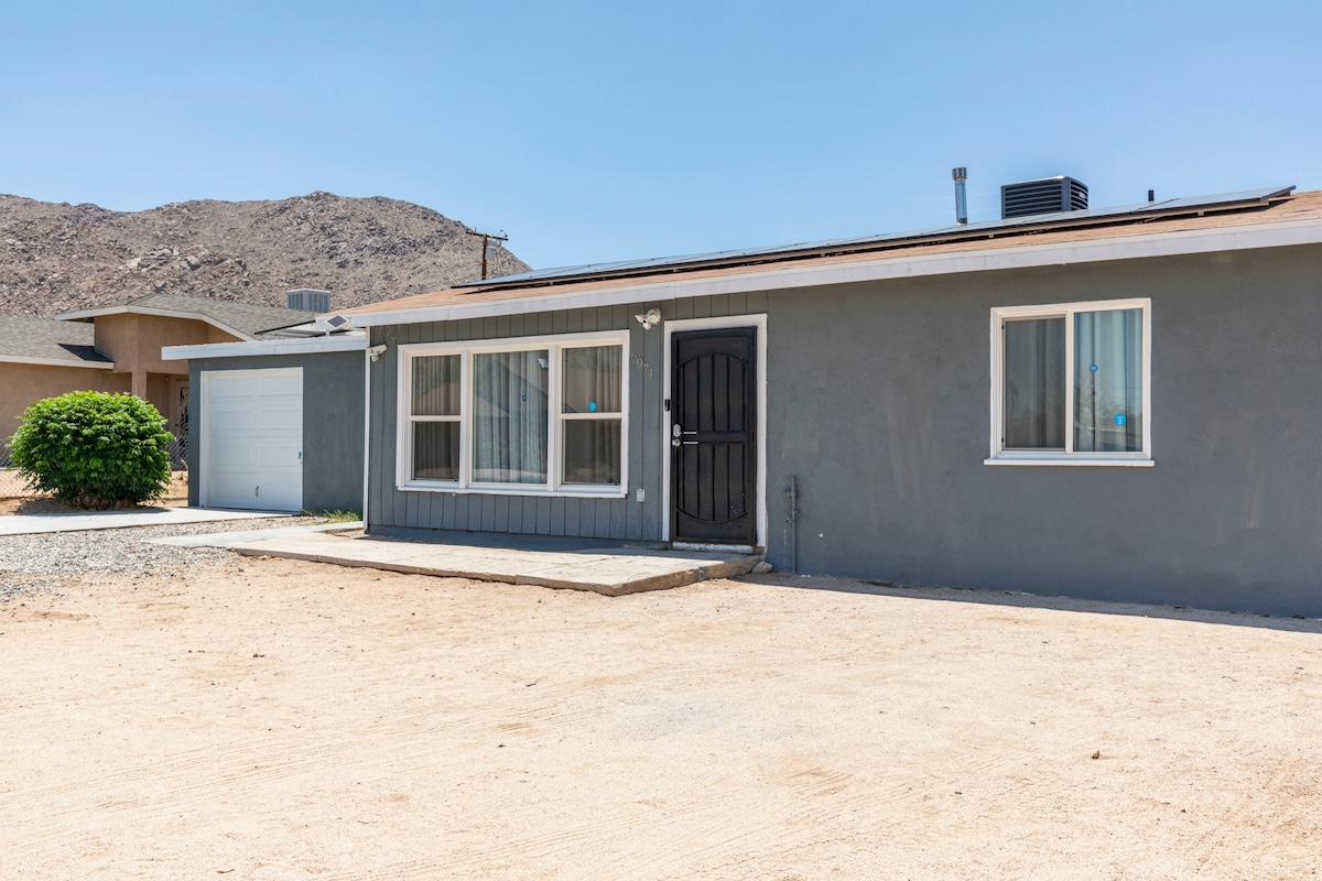 Kein Haus liegt näher am Eingang des Joshua-Tree-Nationalparks. Modernes Dekor und alle Annehmlichkeiten für einen erholsamen und komfortablen Aufenthalt, um den Park und den wunderschönen Nachthimmel zu genießen. Riesige Panoramafenster für einen atemberaubenden Blick auf die Berge in alle Richtungen. Du kannst dich auf 2 Balkonen, an der Feuerstelle entspannen oder einen Grill haben, der von weiten Freiflächen und frischer Luft umgeben ist. Die Gäste lieben die unmittelbare Nähe zum Nationalpark und die ruhige abgelegene Lage. Perfekt für Sternbeobachtung und Astrofotografie.