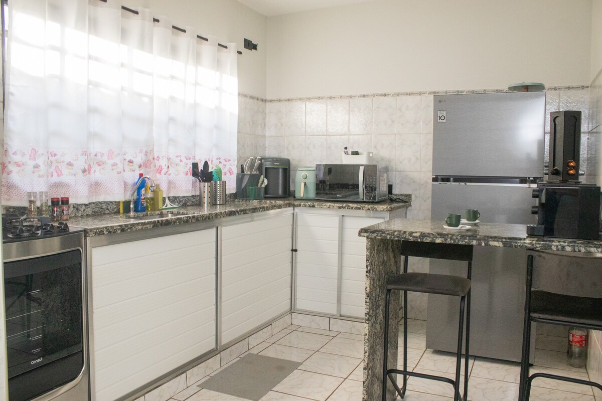Ganze Haus (möbliert) für bis zu 4 Personen im Zentrum von Pirassununga. 02 Schlafzimmer (01 Doppelbett und 02 Einzelbetten). Gemütlicher Ort, mit Garage für kleines Auto (automatisches Tor); WLAN, 03 Fernseher (01 Smart), Ventilator, Küche mit Kühlschrank, Mikrowelle, Herd, Geschirr und so weiter. Wir bieten Bettwäsche/Handtücher, Waschküche mit Waschmaschine und Tank. Wir sind 5 Minuten vom Busbahnhof, dem zentralen Platz, dem städtischen See, Supermärkten, Bars, Geschäften und Restaurants entfernt. Die Preise können sich ändern!