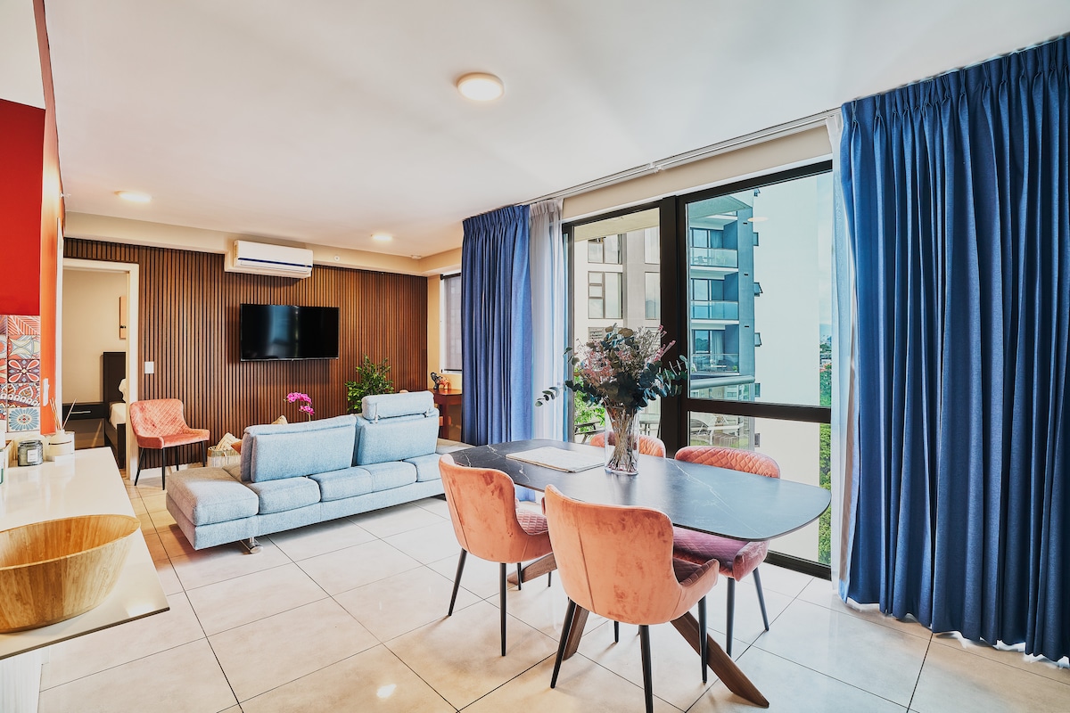 Enjoy luxury and nature in this stylish 2BR, 2BA apartment in Sabana. AC & private parking included. 16 minutes from international airport. Wake up to river views and greenery while enjoying over 30 top-tier amenities: rooftop, swimming pool, gym, cinema, coworking, soccer field, and a vibrant food zone. Sleeps up to 5. Located in one of San José’s most dynamic areas, just minutes from La Sabana Park. Ideal for relaxing or remote work in a premium natural setting. Full equipped