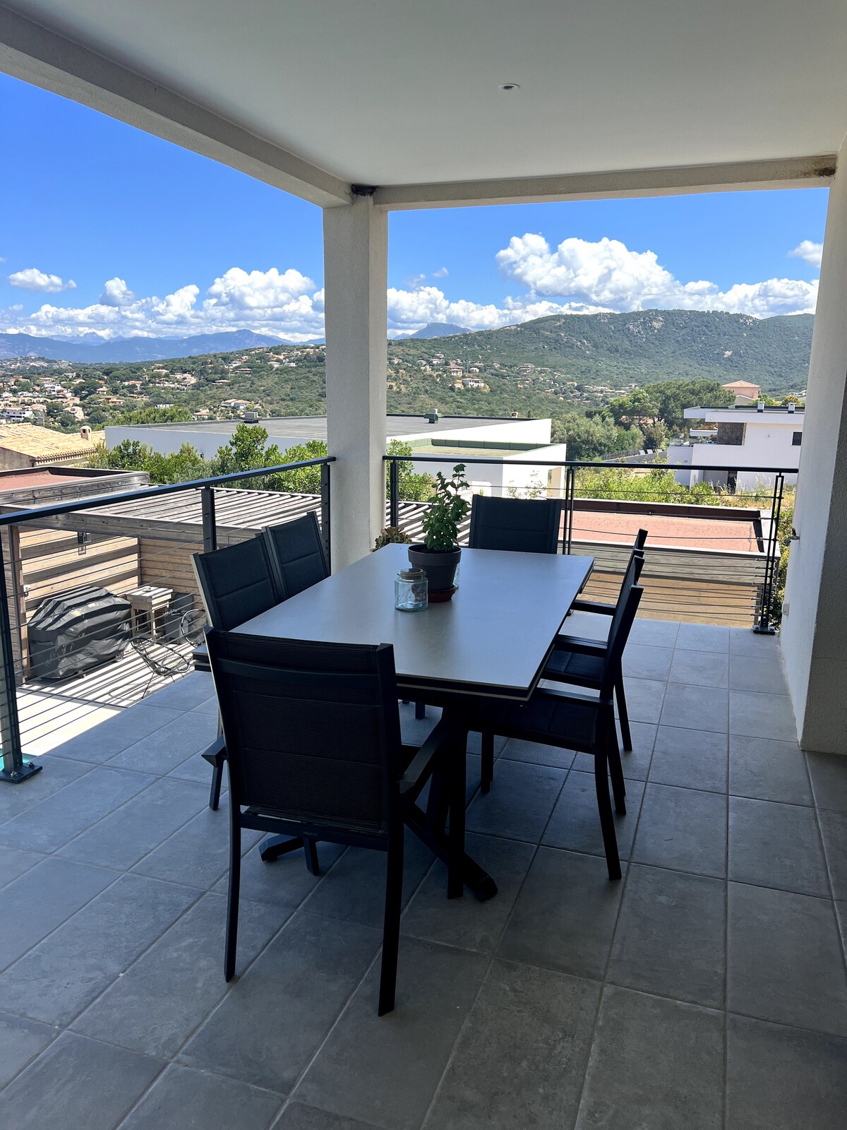 Haus mit einer Fläche von ca. 90 m2 mit Panoramablick auf den Golf von Ajaccio, die Sanguinaires-Inseln und die Halbinsel Isollela. 2 Terrassen aus exotischem Holz mit einer Gesamtfläche von ca. 130 m2, ca. 20 Minuten von Ajaccio und 15 Minuten vom Flughafen entfernt, kleines Zentrum 10 Minuten zu Fuß (Supermarkt, Tabak, Presse, Post, Restaurants). In der Nähe der schönsten Strände der Rive Sud. Gepflegte Dekoration. Klimaanlage in allen Räumen. Komplett renovierte Küche (2025) Neue Haushaltsgeräte.