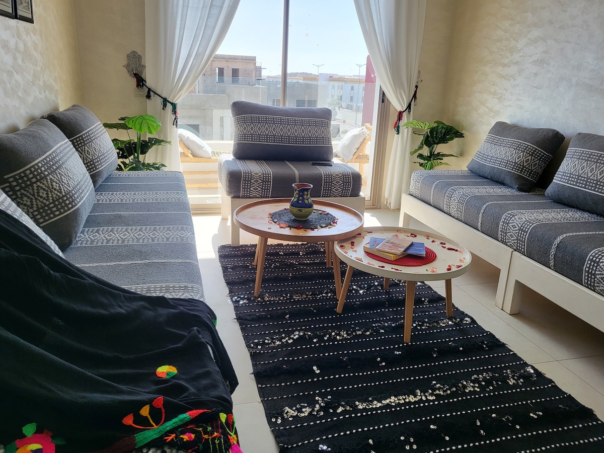 Wunderschöne moderne und helle Wohnung, in einer Residenz mit Pool und Aufzug im ersten Stock. Nur 100 m vom Strand entfernt und in der Nähe zu allen Annehmlichkeiten (Taxi, Arzt, Carrefour, Atacadaw und mehrere Restaurants und Cafés. Die Unterkunft bietet ein gemütliches Wohnzimmer mit großem Sofa, eine voll ausgestattete offene Küche, ein Schlafzimmer mit Kingsize-Bett, ein funktionales Badezimmer und schnelles WLAN (52 Mb/s). Ideal für einen angenehmen und erholsamen Aufenthalt in Essaouira.
