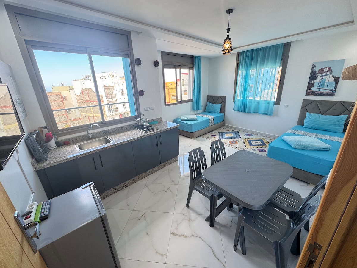 This bright apartment combines authentic Moroccan style with modern comfort. Large windows open to breathtaking views of the ocean , the perfect spot for your morning coffee or sunset relaxation. Inside: -A cozy double bed -A stylish salon with sofa & TV -A fully equipped kitchen with fridge -Private bathroom with shower -Free High-speed Wi-Fi Perfect for both vacations and remote work. Breakfast is served on the rooftop terrace, the perfect spot to start your day with a beautiful ocean view.