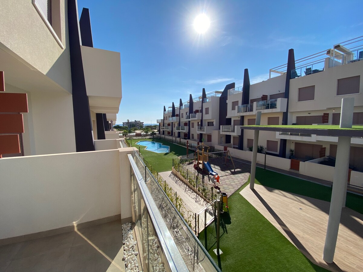 Luxuriöses Apartment, nur 15 Gehminuten vom berühmten Sandstrand La Zenia entfernt. 2 Terrassen mit Blick auf den Pool-/Gartenbereich und praktische Parkplätze an der Straße. Alles, was du benötigst, ist nur einen kurzen Spaziergang entfernt. Zentrale Klimaanlage, Geschirrspüler, Waschmaschine/Trockner. WLAN, Fernseher.
