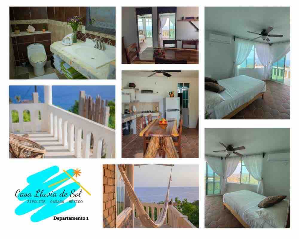 Vive una aventura única y tranquila. Maravillosa ubicación (a 10-15 minutos de playa Zipolite) con vista al mar, alojamiento estilo moderno. Departamento 1 cuenta con: 🔸 2 recamaras con cama matrimonial. 🔸 Cocineta equipada (parrilla de gas, horno de microondas, vajilla y cristalería ) 🔸 Comedor 🔸 Baño completo 🔸 Agua caliente 🔸 Wifi 🔸 Aire acondicionado en cada habitación 🔸 Ventiladores 🔸 Terraza con hamaca 🔸 Estacionamiento