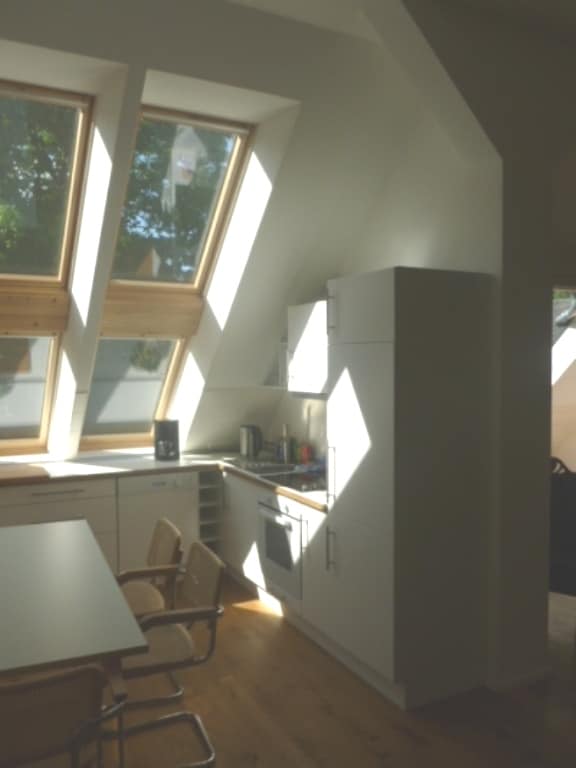 Gemütliche schön helle Dachgeschosswohnung, 2 Einzelbetten 1,00x 2,00 m oder zusammengeschoben als Doppelbett (200x200), sowie ein Einzelbett (100x200) im seperaten Nebenzimmer (auch Ankleidezimmer). Wenn weitere Gäste dazu kommen, besteht die Möglichkeit eine Klappmatratzen für den Fußboden auszuklappen; kleine voll ausgestattete Pantry Küche, tolle Badewanne und Dusche, Fernseher, Telefon und WLAN Eigener Parkplatz ist direkt vor der Haustür vorhanden.