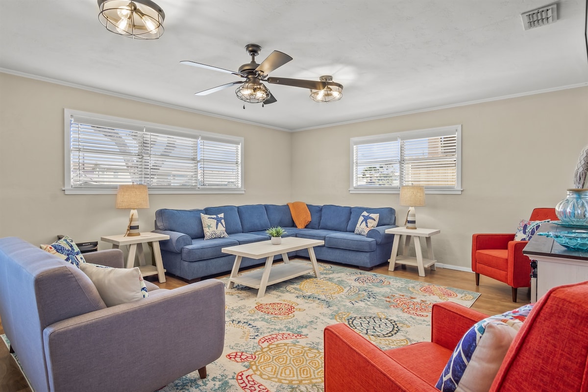 Schön, lustig, komfortabel, Lage – all das beschreibt Peachy Palm, ein 3-Zimmer-/2-Badezimmer-Haus mit über 1600 Quadratfuß im Erdgeschoss. Füge den beheizten (gegen Gebühr) privaten Pool, das unterhaltsame Spielzimmer, die professionell ausgewählte Einrichtung, den Fokus auf Komfort und alle modernen Annehmlichkeiten hinzu, und du hast den perfekten Port A-Aufenthalt gefunden. King-Zimmer, Queen-Zimmer, Etagenzimmer, gut ausgestattete Küche, große Waschmaschine/Trockner, Golfwagen-Zone, nur 5 Blocks zum Strand. Rauchen verboten. Haustiere werden gegen eine Gebühr berücksichtigt. COPASTR: 200/16/056