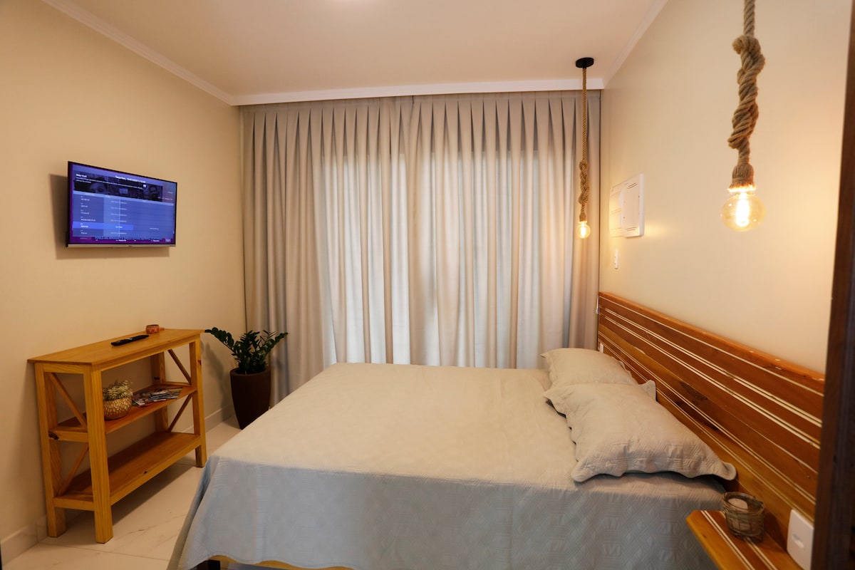 kitnet para 2 pessoas, ótima varanda com churrasqueira, cozinha completa; banheiro; sala com cama de casal, colchão duplo pilow, tv smart. Próximo da praia, mercado, restaurantes. O apto tem, carrinho de praia, 3 cadeiras, cooler, bola, frescobol, prancha de body board. Temos bicicletas para emprestar aos hóspedes. Para 3 pessoas fica apertado, então somente cabe se for uma criança, chame para mais informações. Temos opção de decoração para datas especiais.consulte valores após reserva.