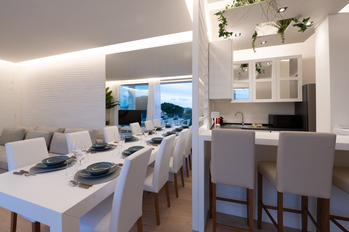 BN3.1 ist eine geräumige und luxuriöse Wohnung in der neuesten Residenz von Palau, die im Jahr 2025 eingeweiht wurde. Im ersten Stock des Komplexes mit einem unglaublichen Blick auf den gesamten Archipel und mit dem wahren Juwel, einer schönen Dachterrasse, mit einem großen Ess- und Entspannungsbereich und einem sensationellen beheizten Jacuzzi mit Meerblick. Es gibt zwei Schlafzimmer, beide mit einem Doppelbett; eines der beiden Schlafzimmer hat auch einen Dachboden, wo man zwei weitere Schlafplätze findet. Die Wohnung verfügt über 2 Badezimmer