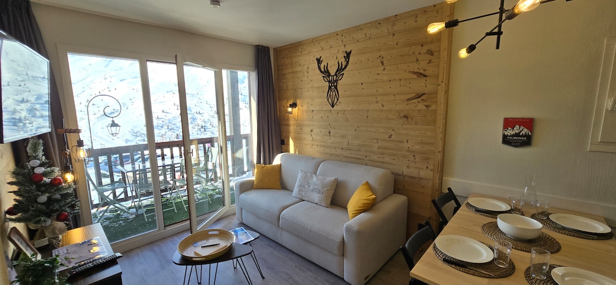 Wunderschöne Wohnung f2 mit herrlichem Blick auf die Berge /Pisten im 4. Stock, im Herbst 2023 renoviert, ausgestattet mit einem Schlafzimmer mit einem Doppelbett und 3 weiteren Schlafgelegenheiten im Wohnzimmer (Schlafsofa und Méridienne für 5 Personen, mit möbliertem Balkon und Skiraum. gebäude le chamois, 108 place roche noir mit allen Annehmlichkeiten am Fuße des ESF-Gebäudes, Fuß der Pisten, Sportgeschäft, Supermarkt, Verkaufspakete ......
