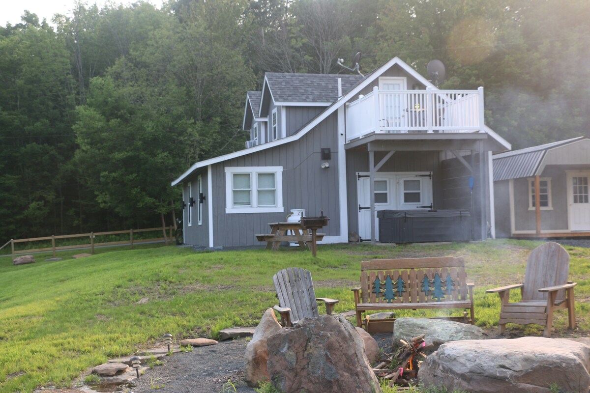 Entfliehe diesem schönen abgelegenen Ort in der Region Catskills. Atemberaubende Aussicht auf Berge und über 10 Hektar Land zum Erkunden. Auf dem Grundstück befindet sich ein Whirlpool, eine Feuerstelle und ein ruhiger Teich, an dem du dich einfach zurücklehnen und die Aussicht genießen kannst. Wir sind etwa eine 15-minütige Autofahrt vom Skigebiet Windham Mountains, 13 Minuten von Bearpen Mountain Sports, weniger als 30 Minuten vom Hunter Mountain und weniger als 40 Minuten von den Kaaterskill Falls (dem berühmtesten Catskill Mountain Wasserfall) entfernt.
