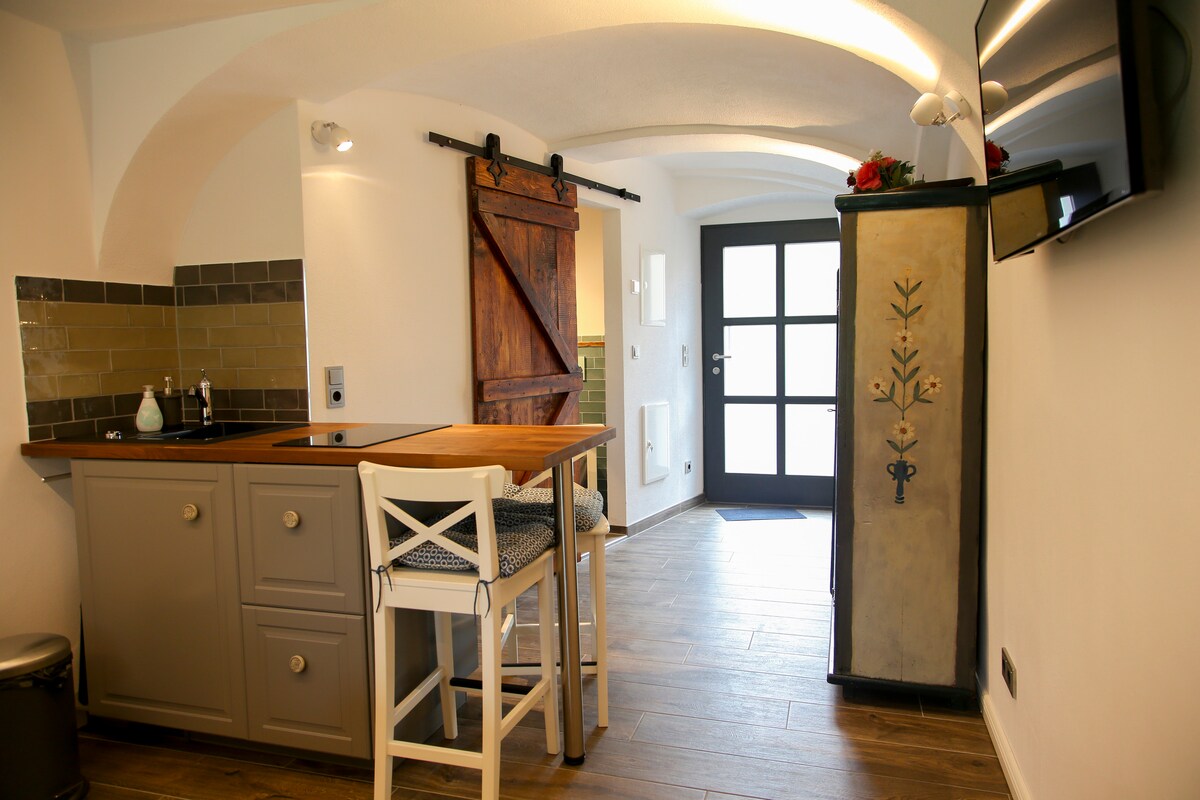 Genießen Sie einen angenehmen Aufenthalt in ruhiger Lage zum Wandern, Radfahren, Arbeiten oder einfach nur Relaxen. Die Ferienwohnung verfügt über einen eigenen Eingang und eine Terrasse. Die offene voll ausgestattete Küche (Backofen, Mikrowelle, Kaffeemaschine) bietet mit großem Esstisch und einer zusätzlichen Schlafmöglichkeit Raum für eine Familie oder max. vier Personen. Der Wohnraum ist als Durchgangszimmer zur Dusche und WC mit Schreibtisch und einer weiteren Schlafcouch ausgestattet.