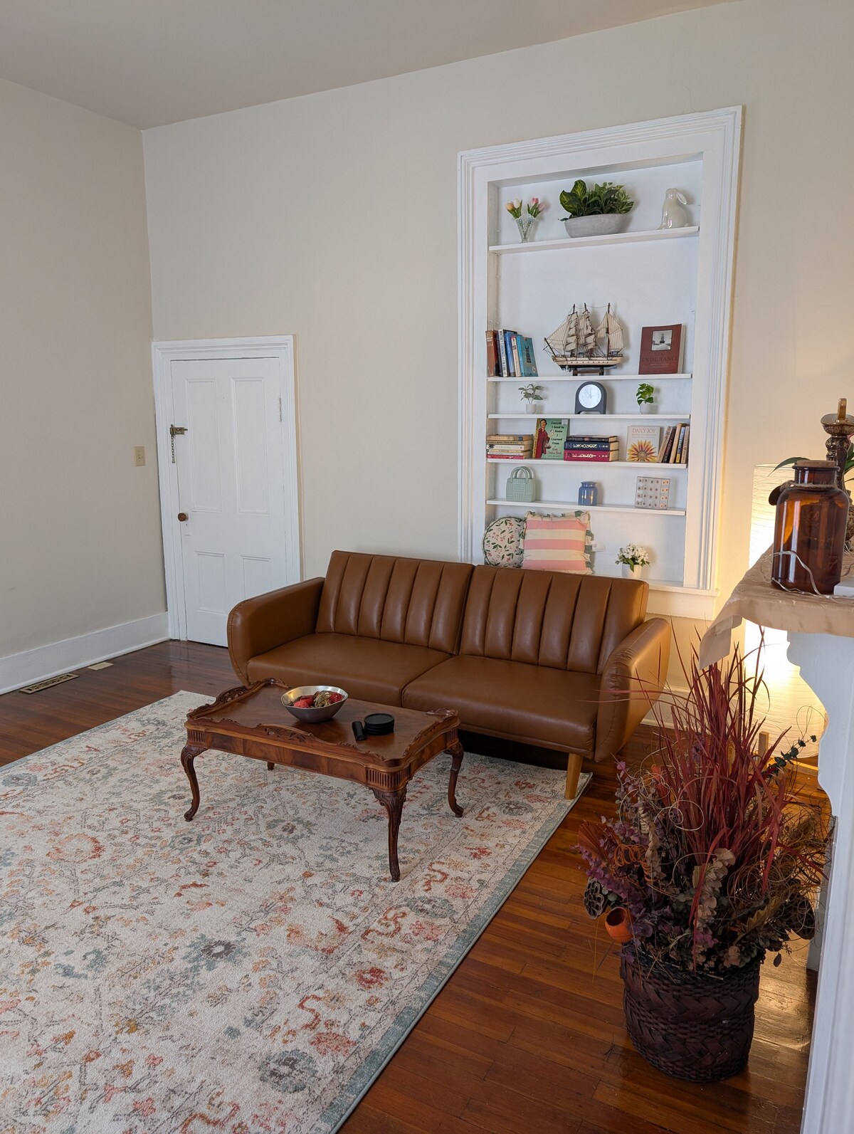 Super cool first floor studio apartment nestled in RVA's pedestrian-friendly Fan District. You'll be steps away from bars, restaurants, and art galleries in this "very Richmond" location. Built in 1900, the space has impressive features including a huge bay window overlooking lively W Main St and two (non functional) fireplaces. Velvety curtains divide the bedroom/living area from the eat-in kitchen. Lovely high ceilings. Art and furnishings give cottage in the city vibes.