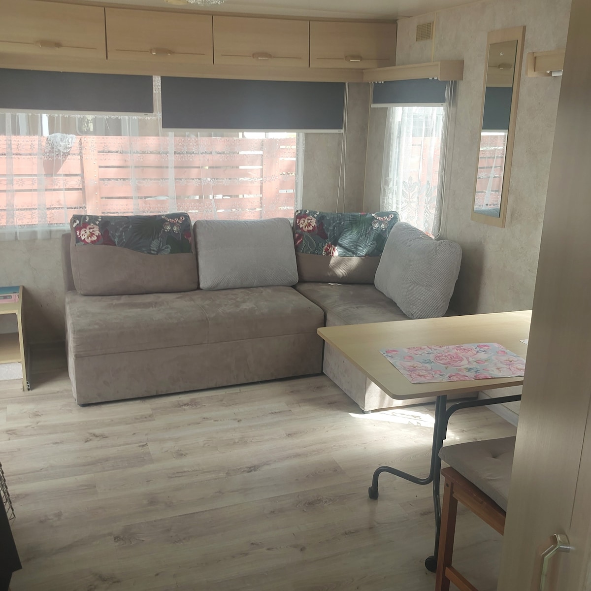 Ein Ferienhaus am Meer ? Sicher! Ab dieser Saison können Sie auf Camping Alex an der Ostsee ein gut ausgestattetes Ferienhaus mieten. Es verfügt über zwei Doppelbetten: das erste (groß, 140x200 cm) auf dem Zwischengeschoss, das zweite (kleiner, ausklappbar 120x180 cm, für Kinder) auf der Unterseite. Separates Badezimmer, große Dusche und Küchenzeile mit allem, was während des Urlaubs nützlich sein kann. Bettwäsche und Handtücher sind im Preis enthalten. Vor dem Ferienhaus finden Sie auch eine Sitzterrasse.