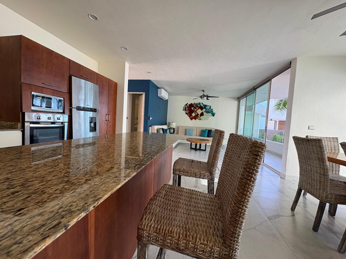 Schönes Haus direkt am Meer. Es verfügt über 4 Schlafzimmer (3 im Obergeschoss und 1 im Erdgeschoss) mit jeweils einer Klimaanlage, einem großen offenen Raum mit Wohnzimmer, Esszimmer und einer voll ausgestatteten Küche. Es verfügt auch über einen Pool, Planschbecken, Palapa, Hängematte und Parkplatz.