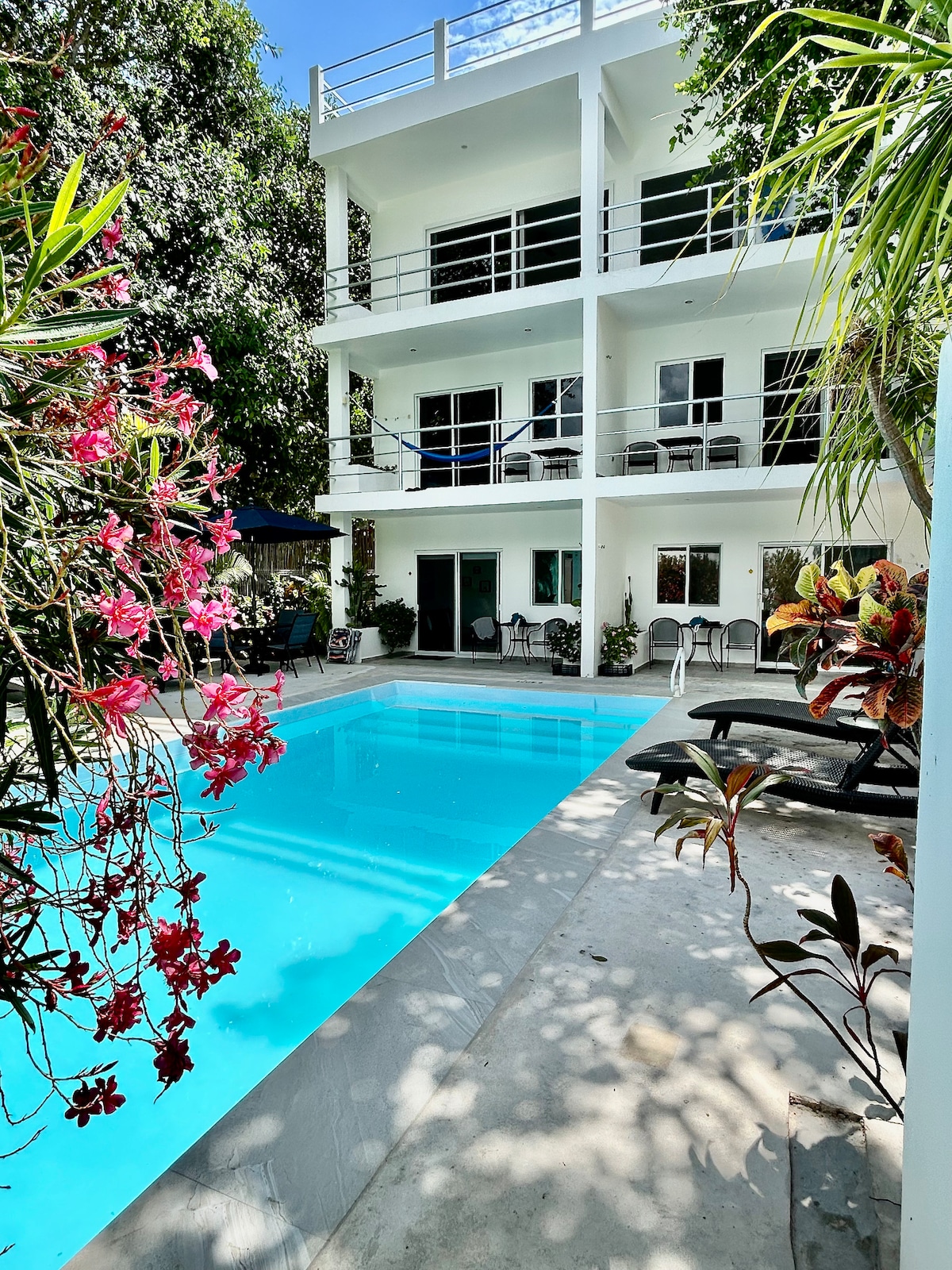 Komm und genieße einen ruhigen und schönen Ort mit Pool, Terrasse, Liegestühlen und Hängematte. In der Küche gibt es Utensilien zum Kochen. Im Badezimmer stellen wir Handtücher, Shampoo und Duschgel bereit. 🧴 Sie liegt in der Nähe von Chedraui, du kannst dort in 5-8 Minuten zu Fuß hin. Ist einen Block von der Hauptstraße Juarez Avenue entfernt, wo du ein Taxi oder einen Van nehmen kannst. In der Juarez Avenue gibt es ein paar kleine Restaurants, eine Wäscherei und den Lebensmittelladen Oxxo. Es ist 3 Blocks von der Autobahn entfernt, wo du die Vans nach Tulum oder Cancún nehmen kannst. 20 Minuten zu Fuß zum Strand.