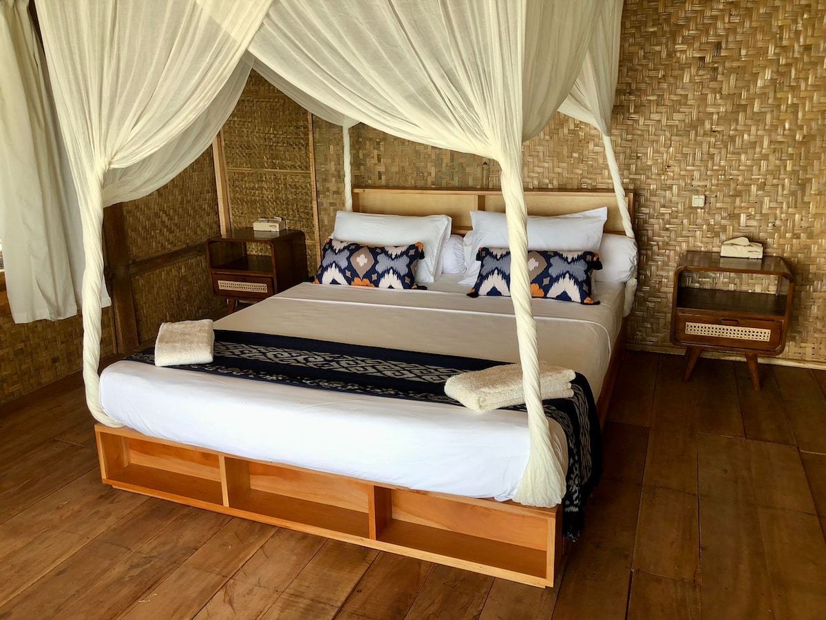 Unsere Bambushütte ist eine schöne Mischung aus Bambus- und gehobenem Dockholz mit herrlichem Meerblick im Süden und Westen. Es ist für 2-3 Gäste geeignet, bietet aber Platz für vier Personen mit einem Zustellbett. Es verfügt über einen Schreibtisch mit Blick, ein eigenes Badezimmer im Freien, eine schöne Holzterrasse und Liegestühle. Angetrieben an Solarenergie und hergestellt aus dem nachhaltigsten natürlichen Baustoff, das zur Verfügung steht, ist dies die erste hauptsächlich Bambusstruktur von Desa Laguna.