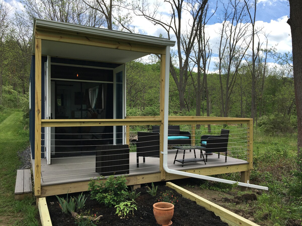 Baby Blue in Sugar Creek ist ein 8 Fuß x 20 Fuß großes Schiffscontainerhaus auf 10 ruhigen, parkähnlichen Hektar mit hochragenden Platanen- und Walnussbäumen, vielen Wildtieren und einem Bach, der durch das Grundstück fließt. Sehr privat und ganz in der Nähe aller Vorzüge der Finger Lakes. Weingüter, Brauereien, Wandern, Radfahren und Keuka Lake sind nur wenige Minuten entfernt. Auf Instagram unter babyblue_sugarcreek