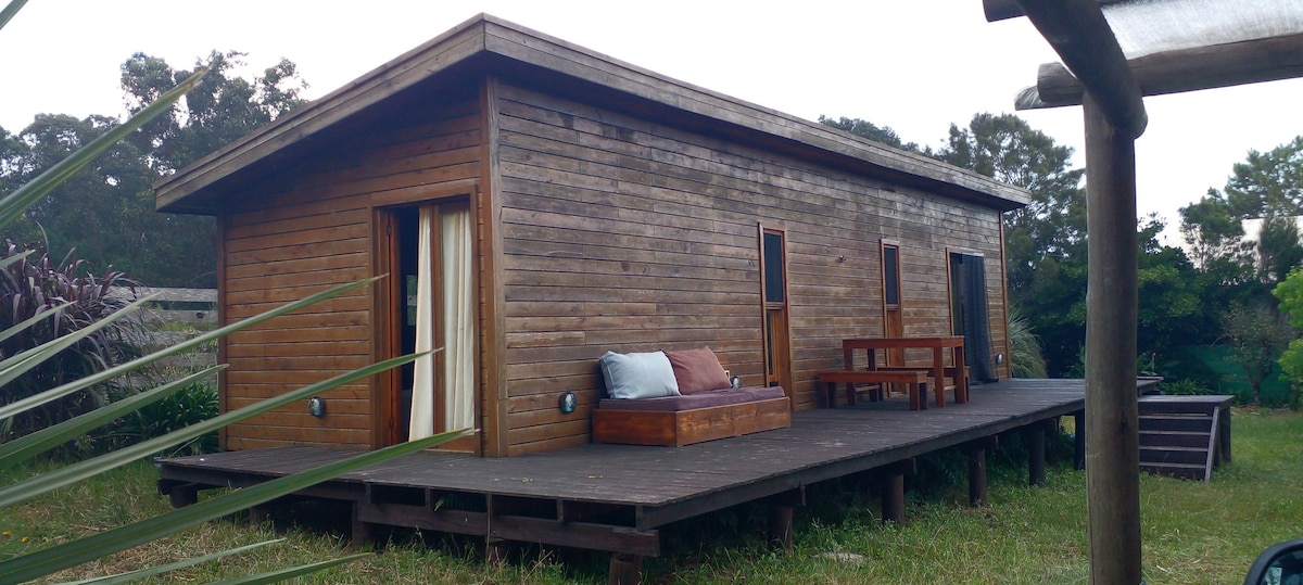 Casita de madera, con mucha onda y detalles que la hacen cómoda y linda, totalmente equipada para el disfrute. Ubicada a 150 metros de la playa. Para vivir la naturaleza en estado virgen, cielos, mar, mariposas, canto de aves y aire puro. Tiene una cama doble queen que puede transformarse en dos camas de una plaza. Hay también dos camastros que forman una cama de una plaza extra. Deck con pérgola en el exterior. Cocina completa. Baño con ducha. Fogón c/ parrilla. Ideal 2 personas, máximo 3.