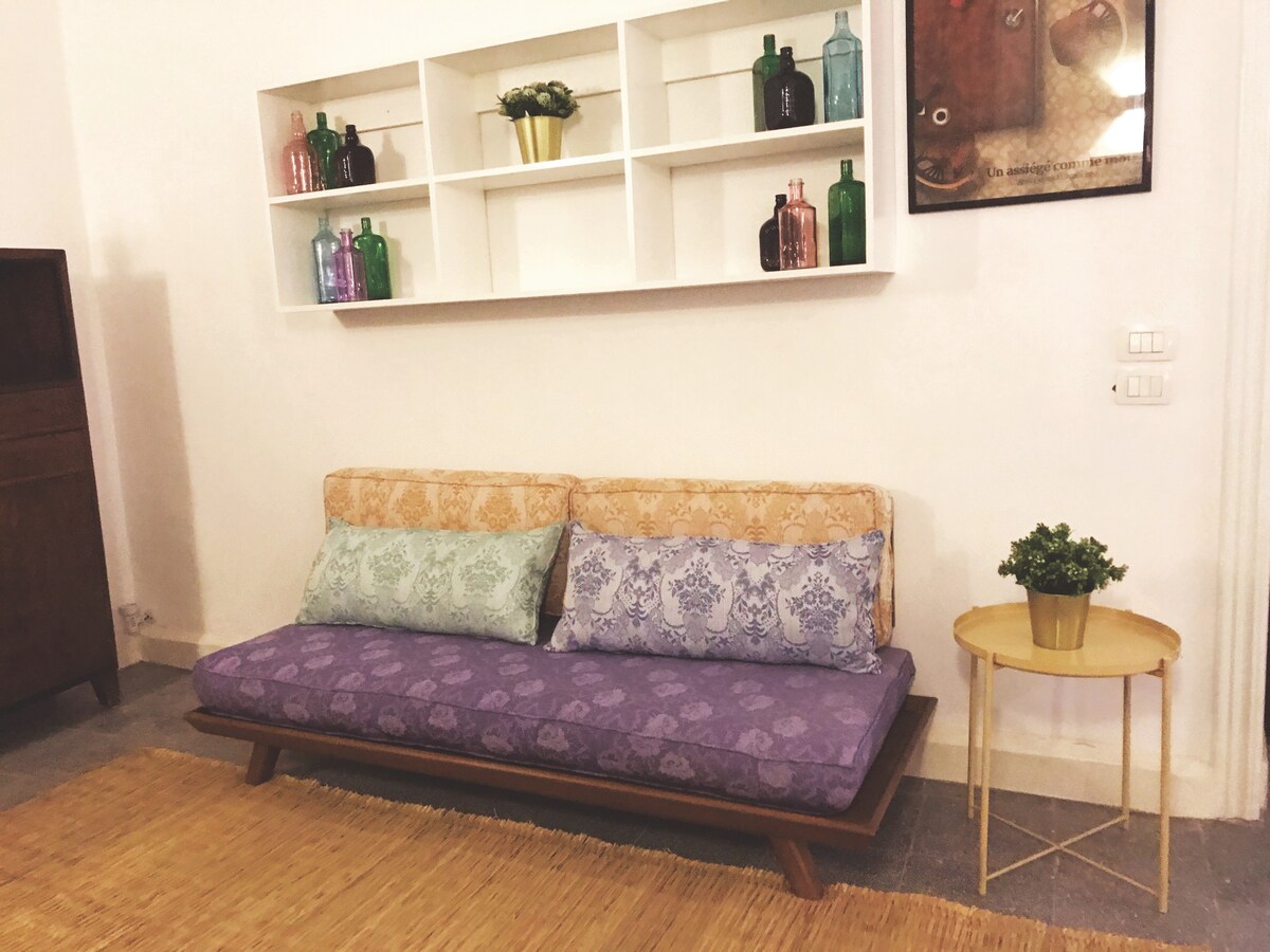 Die Wohnung befindet sich in einem historischen Gebäude in der schönen Garden City; einem historischen Viertel im Herzen von Kairo aus dem frühen 20. Jahrhundert. Die Gegend ist bekannt für ihre grüne, ruhige, gehobene und sichere Atmosphäre und ist ein wichtiges Ziel für Touristen, die den wahren Charme der geschäftigen Stadt erleben möchten, mit der Möglichkeit, sich leicht (zu Fuß) in diese ruhigere Zone zurückzuziehen. Die historische Wohnung mit 4 Meter hohen Decken wurde in einem minimalistischen Stil renoviert.