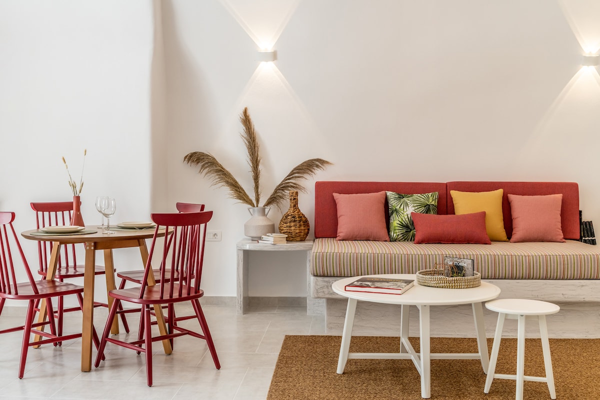 Stell dir vor, du entspannst dich in der weiß getünchten UNESCO-Stadt Pyrgos – dem höchsten Punkt von Santorin – wo du bei einem Glas Wein den Sonnenuntergang hinter einem Vulkan beobachten kannst, nachdem du in einem nahe gelegenen lokalen Restaurant knisterndes Saganaki, frische Meeresfrüchte und Salat genossen hast. Unsere speziell gestaltete Villa in einem Dorf, das sich im Laufe der Zeit nicht verändert hat, wird definitiv deine Anforderungen erfüllen, da du den privaten Balkon mit Whirlpool und Panoramablick auf die Insel genießen kannst.