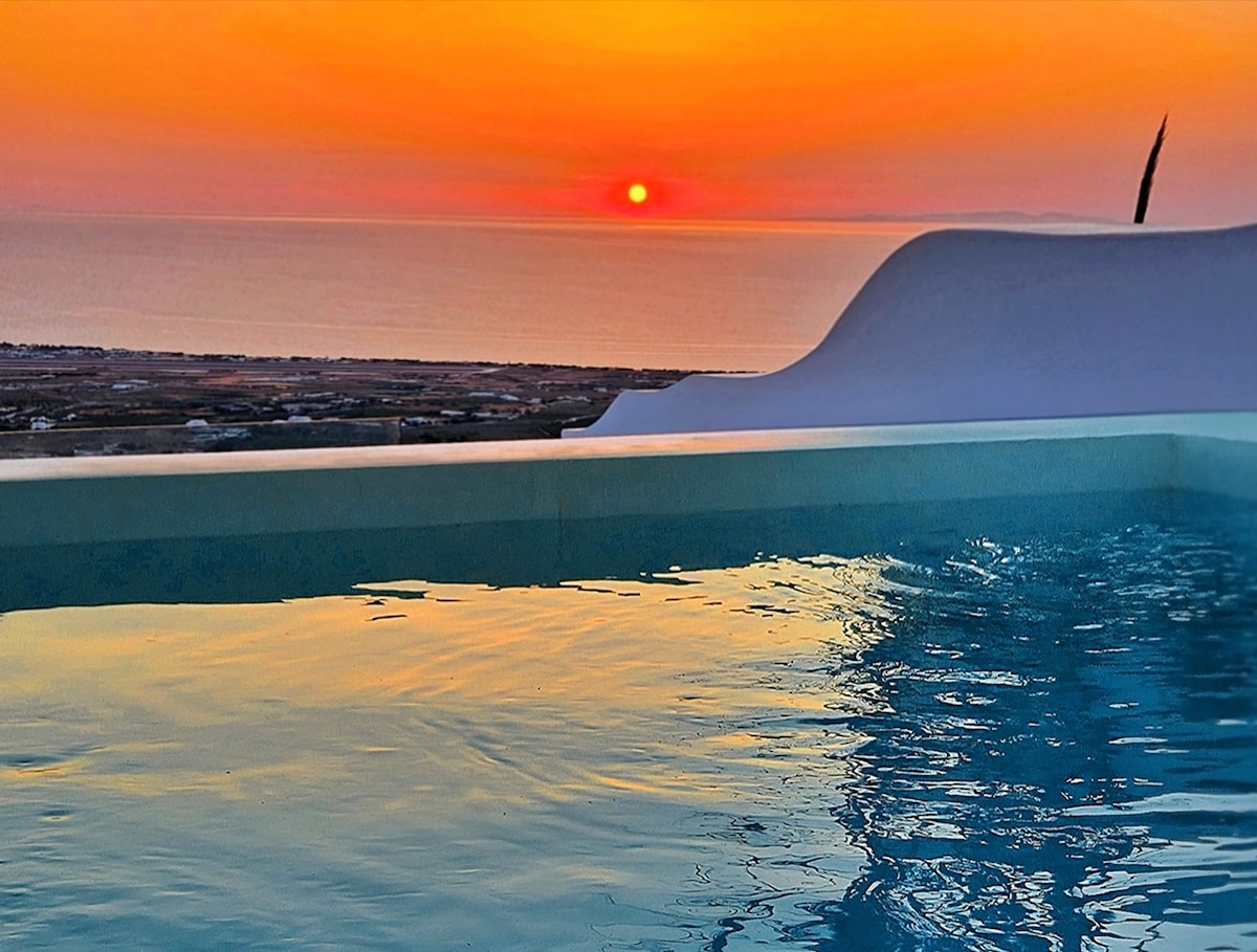 Stell dir vor, du entspannst dich in der weiß getünchten UNESCO-Stadt Pyrgos – dem höchsten Punkt von Santorin – wo du bei einem Glas Wein den Sonnenuntergang hinter einem Vulkan beobachten kannst, nachdem du in einem nahe gelegenen lokalen Restaurant knisterndes Saganaki, frische Meeresfrüchte und Salat genossen hast. Unsere speziell gestaltete Villa in einem Dorf, das sich im Laufe der Zeit nicht verändert hat, wird definitiv deine Anforderungen erfüllen, da du den privaten Balkon mit Whirlpool und Panoramablick auf die Insel genießen kannst.