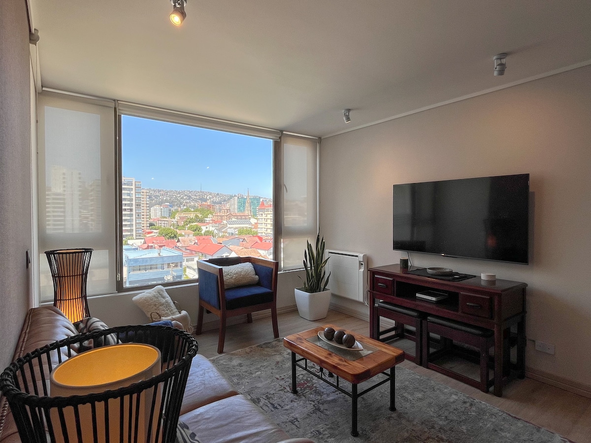 Moderne Wohnung in einem Wohnhaus, komplett ausgestattet, um sich am Meer mit Blick auf die Bucht von Valparaíso zu entspannen. In der Nähe von Supermärkten, Restaurants und Einkaufszentren. Mit Zentralheizung und Glasfaser-Internet zum Arbeiten oder Entspannen.