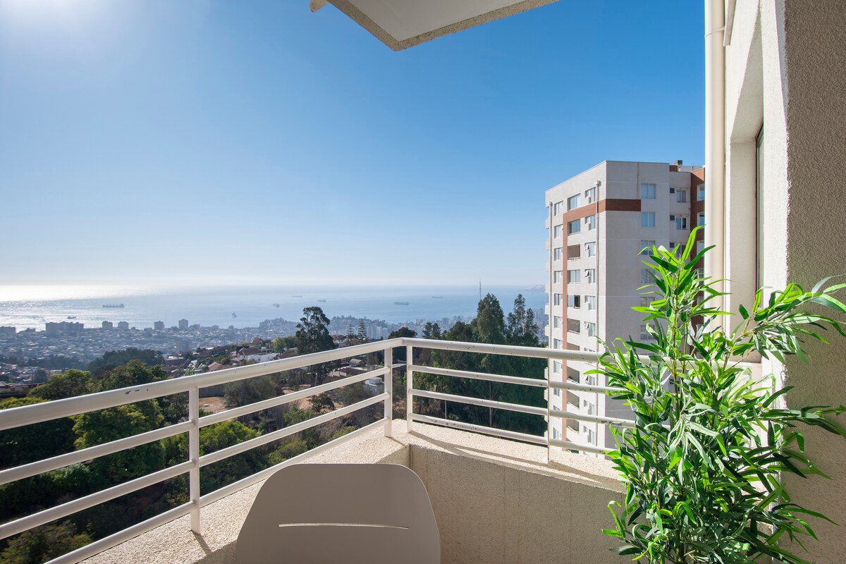 5*-Ferienhaus in Viña/Valparaíso: HERBSTANGEBOT!SPEKTAKULÄRE AUSSICHT, VOLL AUSGESTATTET, PARKPLATZ, FITNESSRAUM, PANORAMATERASSE, WASCHKÜCHE. Im Sommer Außenpool nach vorheriger Reservierung. Das beste Preis-Leistungsverhältnis! Schön, komfortabel, gemütlich. Du WIRST DICH WIE ZUHAUSE FÜHLEN! Mehr als eine Unterkunft, es ist ein Panorama, dort zu sein: hell, in einer ruhigen Wohngegend. Transport 1/2 Block entfernt, Bügeleisen, SmartTV, Haartrockner, Betten gemacht, Bluetooth-Lautsprecher, Entsafter, Öfen, Kaffeemaschine, Salz, Zucker, Tee, Kaffee und mehr.