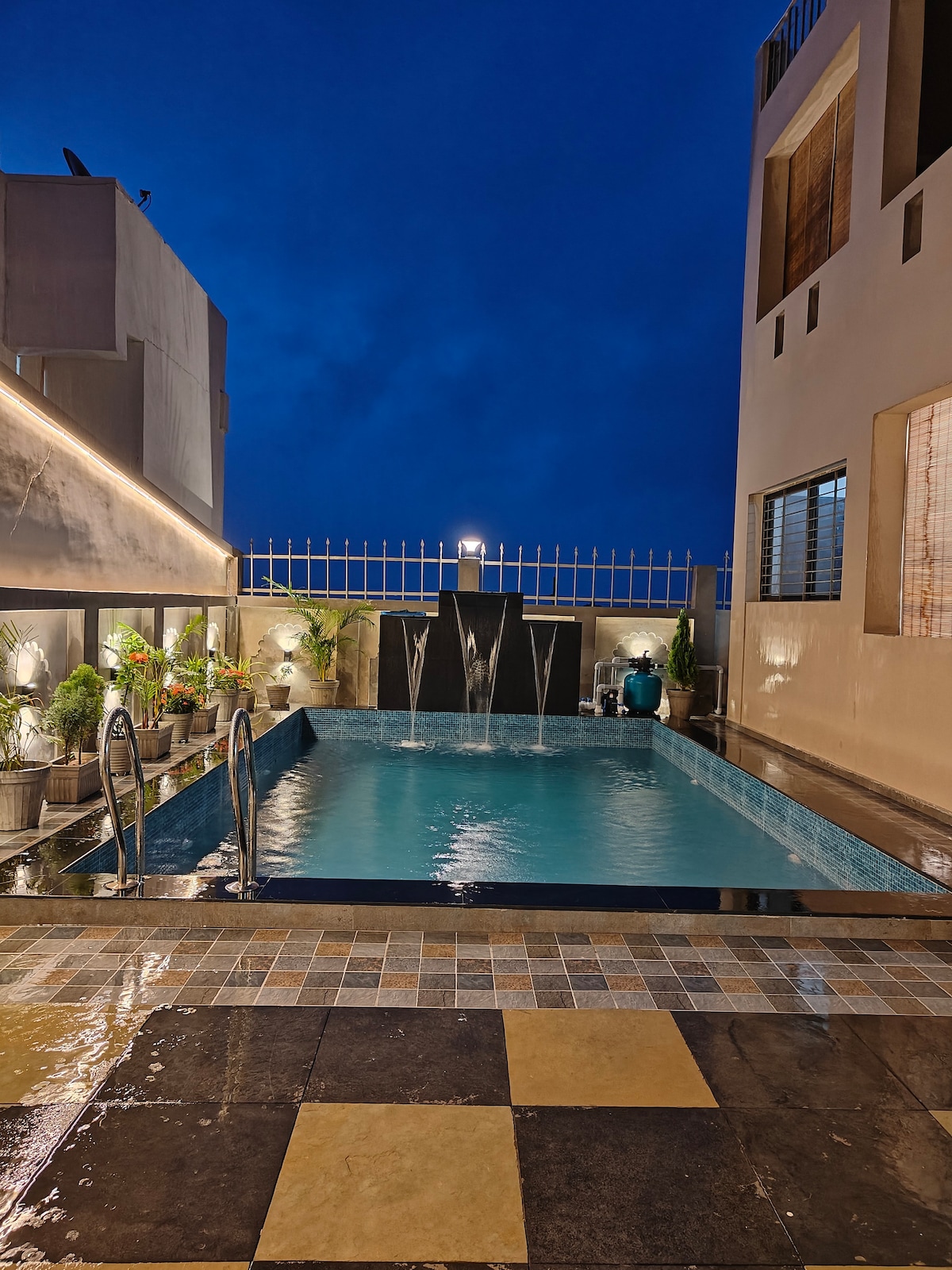 Rein vegetarische Unterkunft – nicht-vegetarisches Essen ist nicht erlaubt. Dieses gemütliche Haus mit 2 Schlafzimmern und einer voll ausgestatteten Küche und einem süßesten Wohnzimmer befindet sich in der City of Lakes. Haben wir den riesigen privaten Pool im hübschen Garten erwähnt? Es ist wie dein persönlicher Wasserspielplatz. Egal, ob du hier bist, um die Schönheit von Udaipur zu genießen oder einfach nur nach einem coolen Treffpunkt mit deiner Bande zu sehn, suchst du nicht weiter als diese Villa.
