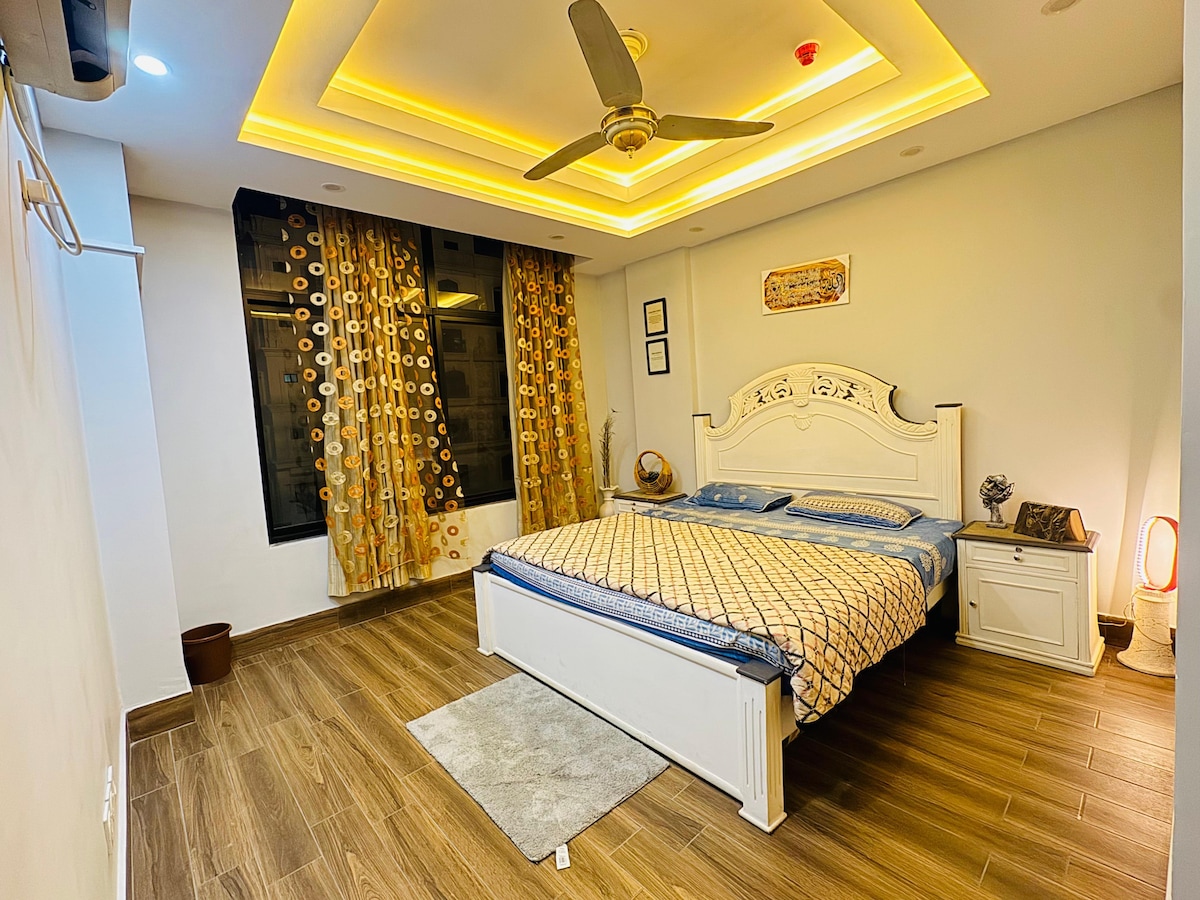 Willkommen in unseren stilvollen Suiten mit zwei Schlafzimmern in DHA 5 Islamabad. Genieße den Komfort eines schnellen Pendelns und entspanne dich in einem Raum mit schöner Einrichtung und einem voll ausgestatteten Heimkino. Ideal für Reisende, die Komfort und Unterhaltung suchen, bietet dieser gemütliche Rückzugsort moderne Annehmlichkeiten in bester Lage. Es ist ein komplett separater Teil mit eigenem separaten Eingang und Parkplatz, familienfreundlich, daher sehr sicher und ruhig. Partys & laute Musik sind nicht erlaubt. Unverheiratete Paare nicht.