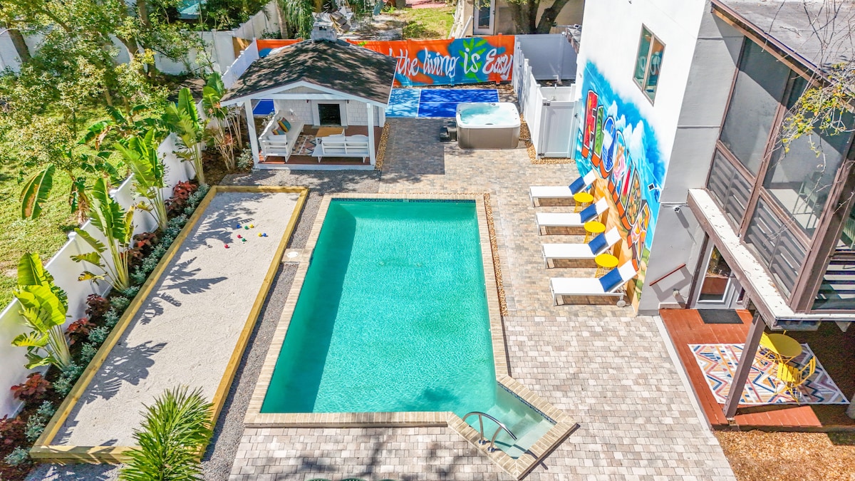 Eine von Bali inspirierte private Resort-Villa, nur wenige Minuten von den Weltklasse-Stränden von St. Pete entfernt, konzipiert als entspannende Heimatbasis für einen unvergesslichen Urlaub in Florida. Ein zweites Zuhause mit allen Traum-Annehmlichkeiten, die für einen ultimativen Strandurlaub geschaffen wurden. Genieße einen beheizten Pool, einen privaten Pickleball-Platz, eine Fasssauna, Minigolf, eine Tiki-Bar, ein Freiluftkino, einen Zen-Raum, einen Fitnessbereich und ein komplettes Spielzimmer mit Karaoke, Skeetball, Pacman aus den 1980er Jahren, einen Billardtisch – alles in einer Dschungeloase – nur 4 Autominuten vom Strand entfernt.