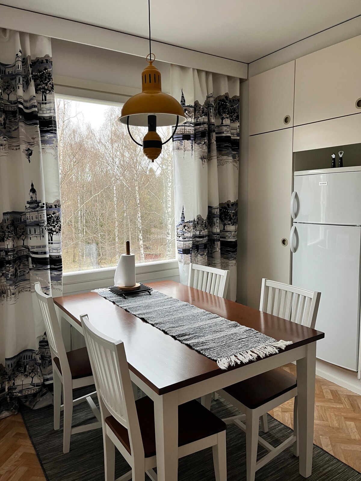 Eine helle, neue, geschmackvoll eingerichtete Zweizimmerwohnung, direkt neben dem Einkaufszentrum Puuvilla. Die Lage der Wohnung ist sehr zentral, aber immer noch ohne Verkehrslärm. Stadtzentrum ca. 1 km, nach Kirjurinluoto 900 m. Die Wohnung verfügt über alle Geräte, die man benötigt, sowie eine Waschmaschine, die trocknet. Doppelbett und Doppelschlafsofa. Bei Bedarf gibt es auch ein Ersatzbett für einen. Wohnung mit 55-Zoll-Fernseher, Radio und WLAN/Glasfaser. Gemütliche Terrasse mit Gartenmöbeln und einem Parkplatz im Hof.
