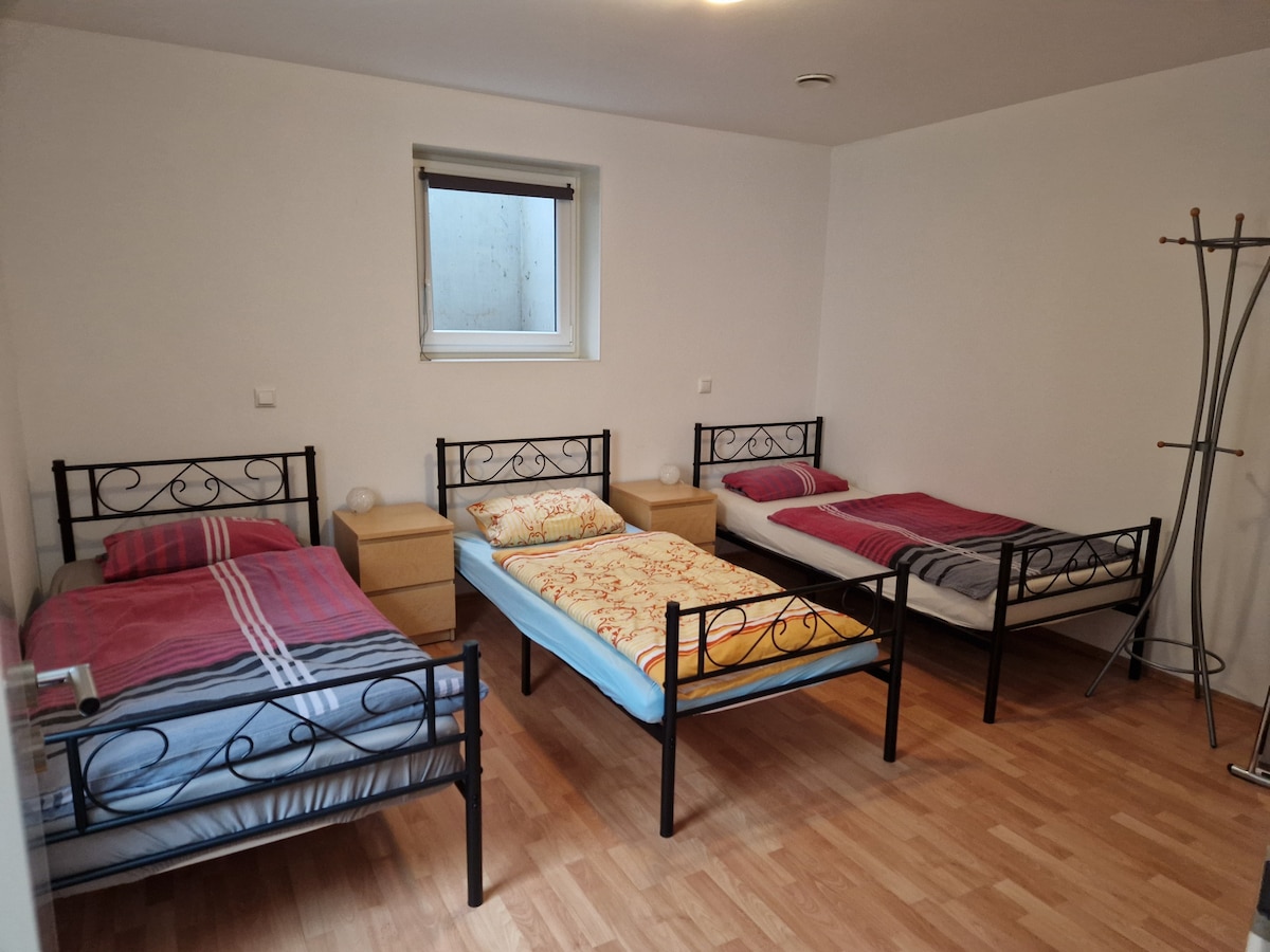 Unser Haus liegt sehr ruhig am Waldrand . Zum Haus gehört ein großer Garten mit Gartenteich. Wir bieten eine gut ausgestattete Küche, ein Schlafzimmer mit Balkon zum Garten, ein Wohnzimmer mit zwei Einzelbetten, beide Zimmer sind mit TV ,Netflix,ausgestattet, ein Bad und eine große Loggia. Hier laden gemütliche Sitzplätze und eine Hängematte zum Entspannen ein. Parkplatz direkt vor der Haustür Übernachtungspreis bezieht sich auf zwei Personen.