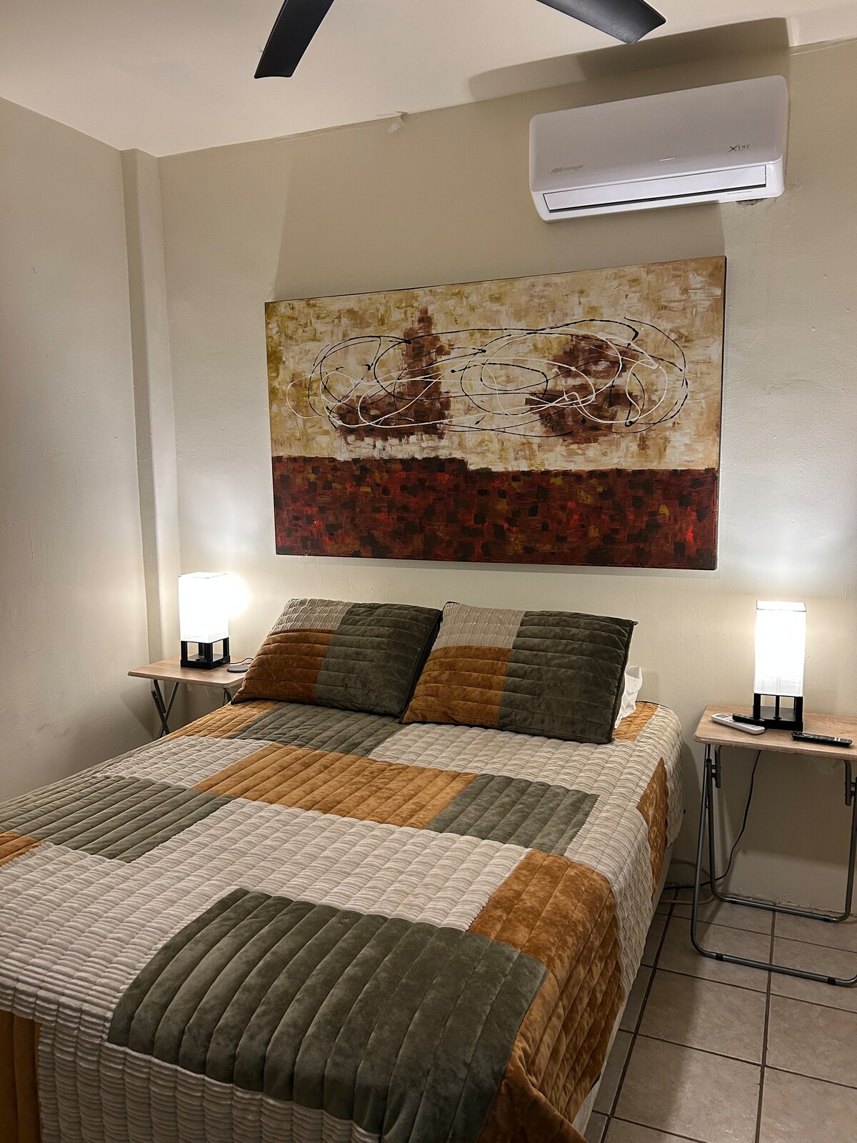 Wir sprechen Englisch! Dieses komfortable und saubere Apartment verfügt über ein Schlafzimmer mit einem Kingsize-Bett für optimale Erholung (ein Kinderbett ist für einen zusätzlichen Gast inbegriffen). Genieße den Komfort einer voll ausgestatteten Küche sowie einer Waschmaschine und eines Trockners für deine Nutzung. Darüber hinaus bieten wir einen überdachten Parkplatz für ein Fahrzeug und den einfachen eigenständigen Check-in, um sicherzustellen, dass deine An- und Abreise einfach und problemlos sind. Der perfekte Ort, um die Stadt mit allem notwendigen Komfort zu genießen!