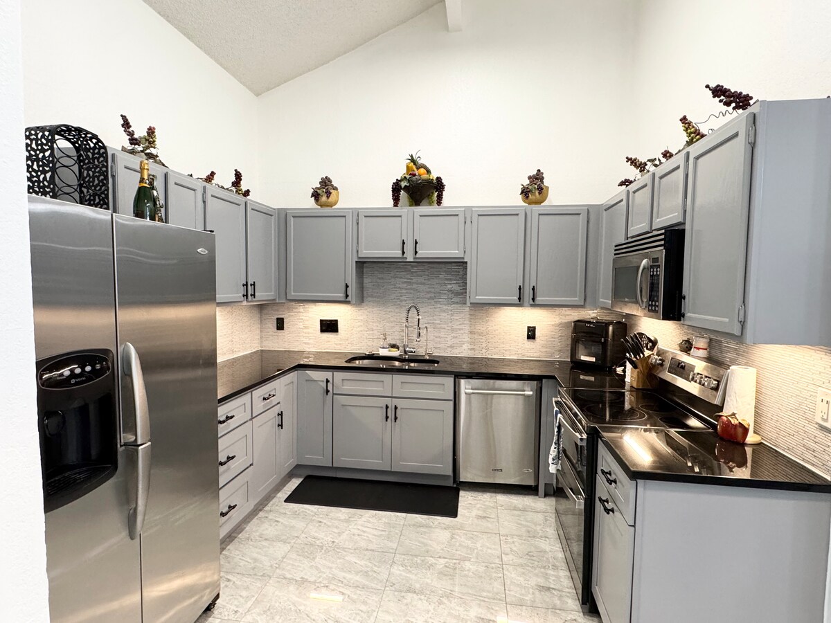 Dieses wunderschön renovierte Haus ist ein unvergessliches Erlebnis, das einen Whirlpool, einen Basketball-Halbplatz, Golfrasen, luxuriöse Bettwäsche und familienfreundliche Annehmlichkeiten bietet, die dich etwas länger bleiben möchten. Voll ausgestattete Küche mit Utensilien, Besteck, Mixer, Kaffeemaschine, Wasserkocher, Toaster, Handtücher, Wohnzimmer, Esszimmer, Waschmaschine und Trockner, voll ausgestattete Badezimmer und vieles mehr.