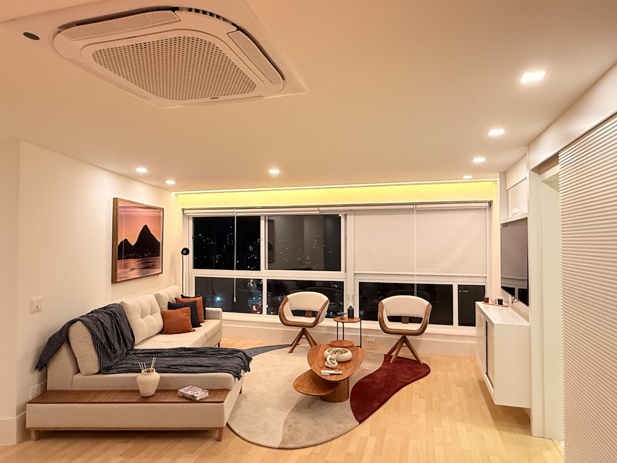 Enjoy a stunning and unique view of both the ocean and the mountain in a centrally located 2 bedroom renovated apartment in Leme, Copacabana ideal for families and couples. The apartment is cozy and has everything you need to make you feel at home. A very spacious and stylishly decorated living room, and a fully equipped apartment. One bedroom has a queen bed, the second bedroom has 2 single beds, and there are 2 more mattress/futons that can be placed in the living room if needed.