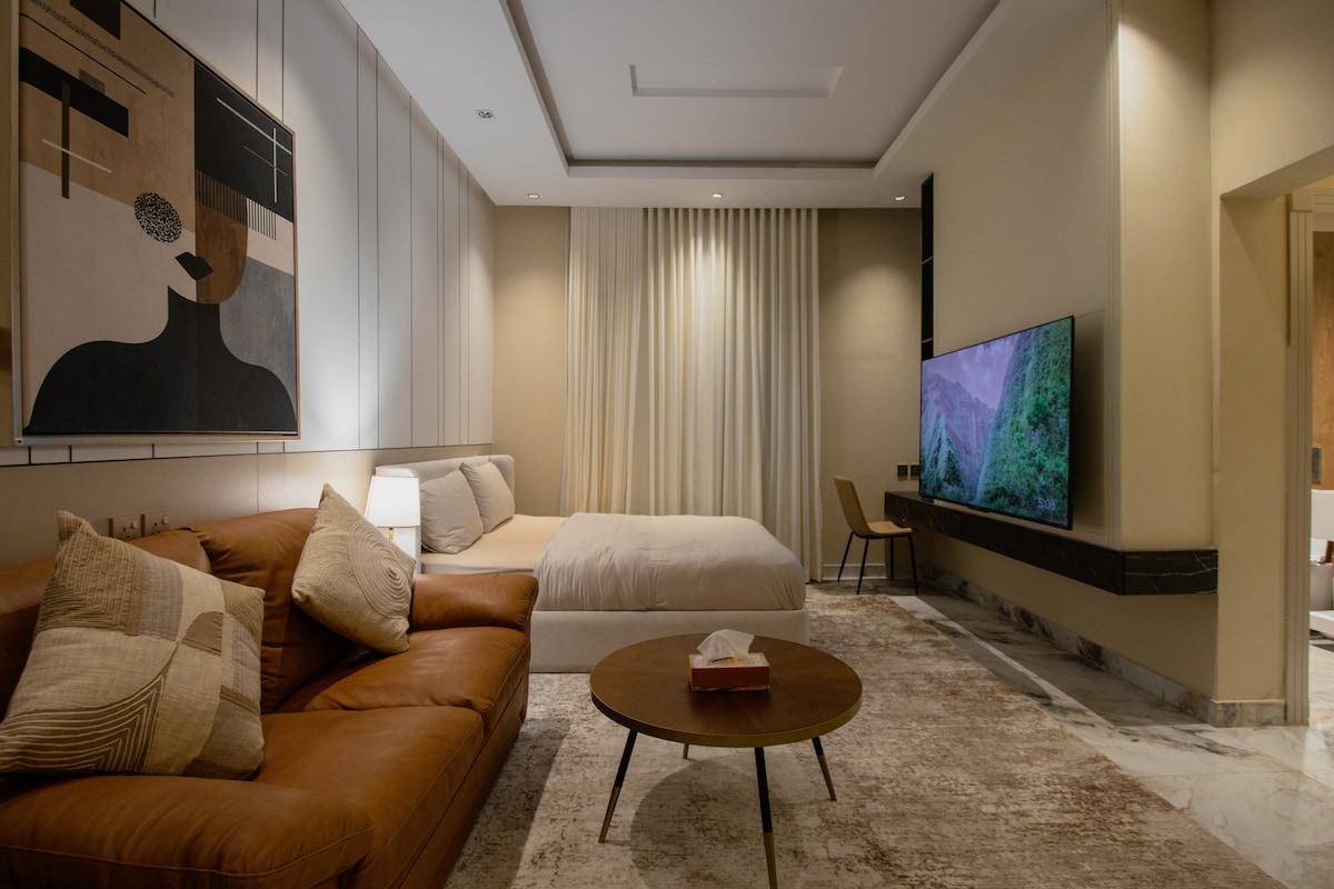 Erlebe eine einzigartige Erfahrung in einem privaten 1BR, der Entspannung und Komfort bietet. Das Apartment verfügt über ein Bett und einen Wohnbereich, in dem du auf einem 65-Zoll-Smart-Bildschirm fernsehen kannst. Es gibt auch eine separate Küche und einen Kaffee, um alle deine Bedürfnisse zu erfüllen. Die Lage ist in der Nähe aller Dienstleistungen, des Touristenziels und der Riyadh Season-Gebiete (Boulevard City World, Kingdom Dome Arena und andere Theater) innerhalb von 5 Minuten. Wir würden dich gerne als Gast aufnehmen und Teile deine Erfahrungen mit uns.