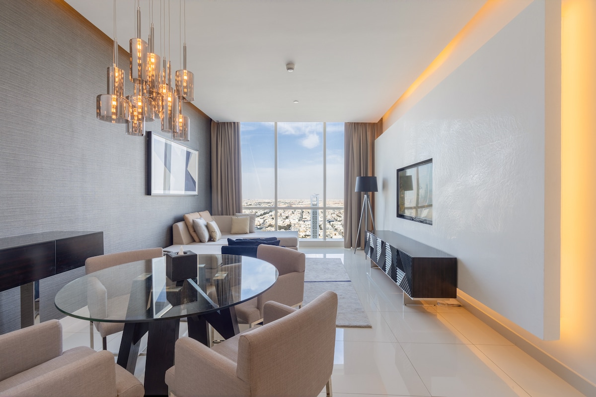 Wohnung in Burj Rafal (Wohnsitz des Eigentümers), über 50 Etagen, Blick nach Norden, für diejenigen, die eine ruhige und vornehme Unterkunft suchen, in der Nähe der bekanntesten Sehenswürdigkeiten von Riad. Voll ausgestattet, gestaltet und eingerichtet mit luxuriösen persönlichen Möbeln; umfasst ein Schlafzimmer mit einem Hauptbett, eine Küche, (2) Badezimmer, filmische Beleuchtung, eine Waschmaschine, eine Kaffeemaschine, einen 75-Zoll-TV und einen großen Bildschirm im Schlafzimmer, einen Luftreinigerfilter und Küchenutensilien, um einen Aufenthalt in völligem Komfort zu verbringen.