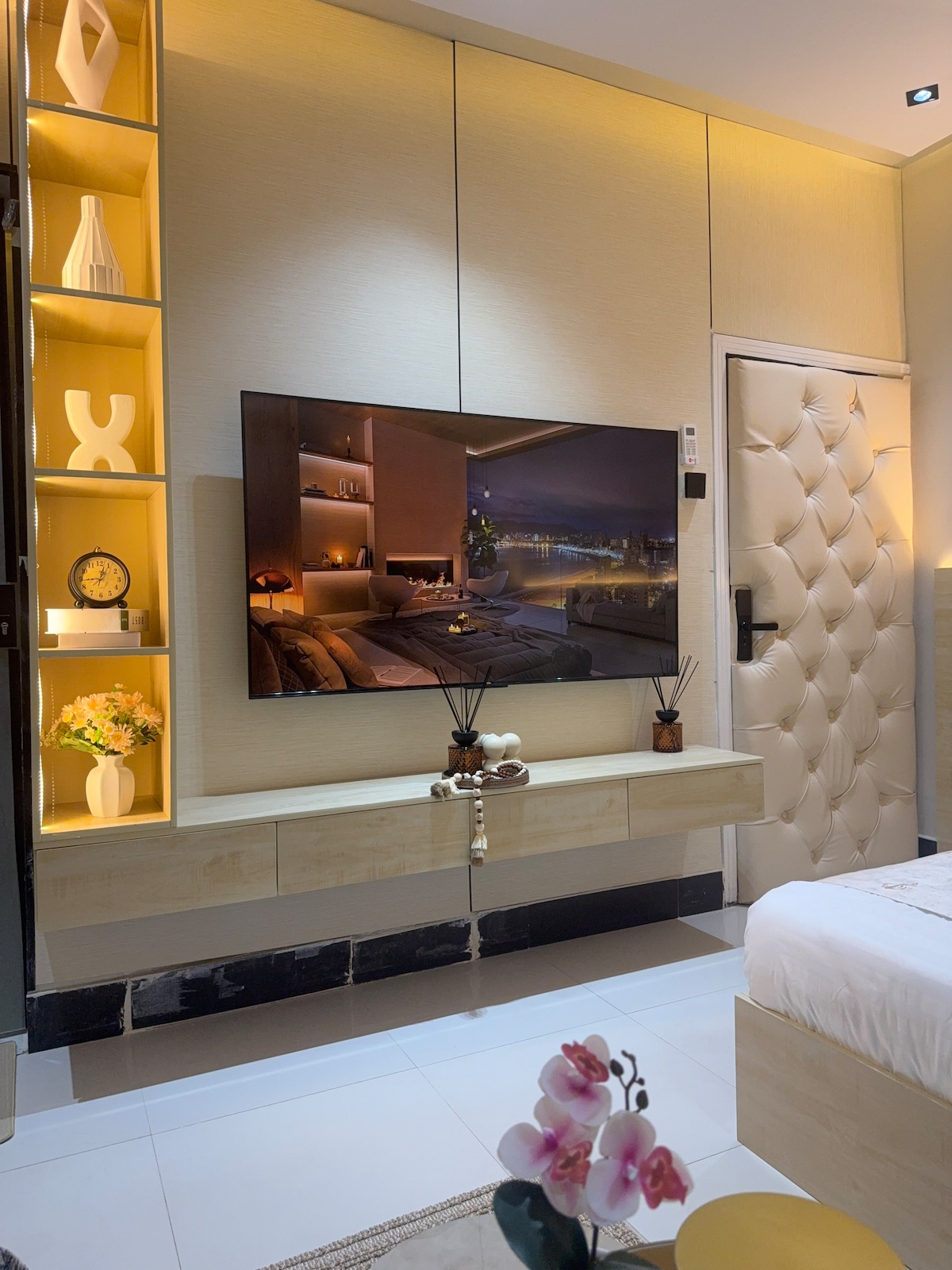 Wo Luxus auf Komfort trifft, für ein außergewöhnliches Aufenthaltserlebnis. Wir freuen uns, dich in unseren sorgfältig gestalteten Studios zu beherbergen, um dir eine ruhige Atmosphäre und einen idealen Ort zu bieten, um dich abseits der Hektik des Alltags zu entspannen. Gastfreundschaft: ☕ Tee – Kaffee – Wasser Vorteile: ✔ Geräumiges und komfortables Queensize-Bett ✔ Komfortables Sofa zum Entspannen ✔ 65-Zoll-Bildschirm mit Shahid- und YouTube-Abonnements ✔ Kühlschrank, um deine Bedürfnisse zu speichern STUDIO'Ze 🌸 Grüße🙏🏻