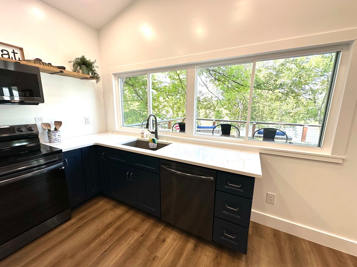 Entspanne dich in diesem atemberaubenden, umgestalteten Kunstwerk. Genieße den Whirlpool und die Terrasse mit 2 Veranden, die einen atemberaubenden Blick auf den See bieten. Das Haus wurde mit 2 separaten Wohnbereichen, hohen Balkendecken und makellosen Details für ein luxuriöses und dennoch charmantes Ambiente gebaut. Die Kinder werden das maßgeschneiderte Etagenzimmer im Keller mit eigener Küche und Wohnzimmerbereich genießen. Bring dein Boot oder deinen Jetski mit und genieße die private Bootsrampe und das Dock. Die Kajaks, der Picknickplatz und die Feuerstelle gehören dir, um sie zu genießen.