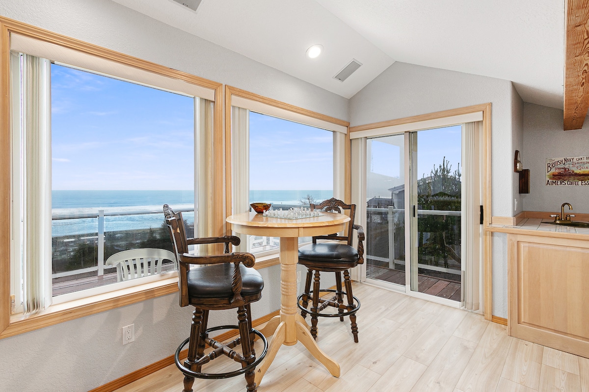 Atemberaubender Panoramablick auf das Meer am Krähennest in Rockaway Beach! Genieße es, von jedem Zimmer aus die brechenden Wellen zu beobachten, einschließlich des Whirlpools! Du hast das gesamte Zuhause für dich allein! Großer offener Grundriss mit vielen bequemen Sitzgelegenheiten für alle. Das großartige Zimmer verfügt über einen großen Flachbild-Smart-TV, Kabel, DVD-Player, Bluetooth-Surround-System für Musik und High-Speed-Internet. Die Küche ist gut ausgestattet mit einer Kaffeebar und vielen Kochutensilien, um den Koch der Familie zu befriedigen!