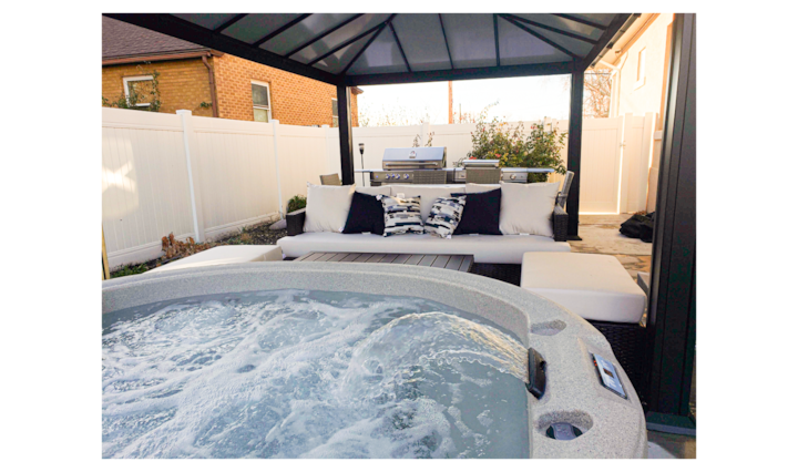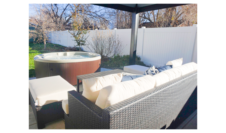 Der extrem private Hinterhof verfügt über einen 6 Fuß langen Sichtschutzzaun aus Vinyl, einen speziellen hochmodernen Whirlpool, gemütliche Sitzgelegenheiten im Freien, ein separates Esszimmer im Freien mit Feuertisch und eine riesige Grillkücheninsel, die sich hervorragend zum Vorbereiten und Kochen im Freien eignet.