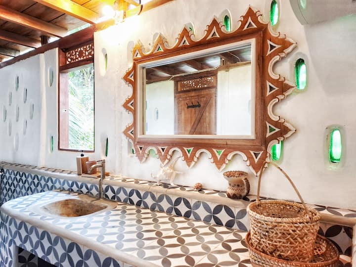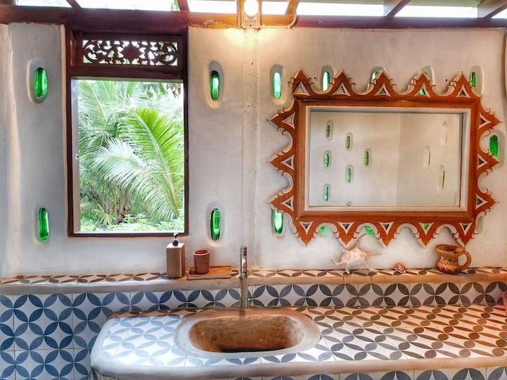 Das im Obergeschoss gelegene Zimmer Maayun („lieben“ in der Kei-Sprache) ist lichtdurchflutet und bietet eine friedliche Atmosphäre mit Blick auf den Garten und das Meer. Seine Dekoration verbindet Naturholz und lokales Kunsthandwerk in einem warmen und eleganten Stil. Das private Badezimmer im Erdgeschoss öffnet sich zu einer angrenzenden Terrasse, ideal zum Entspannen. Ausgestattet mit heißem Wasser, Ventilator und Klimaanlage, verbindet es Charme und Komfort.