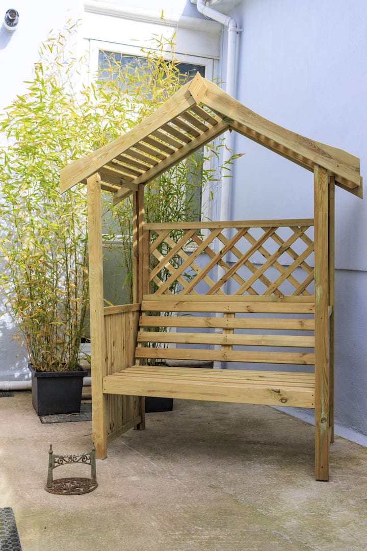 Zu den Annehmlichkeiten im Freien gehören ein privater Garten nach Süden, gestaffelt mit fünf Stufen, zwei Picknickbänke, ein Holzkohlegrill mit nicht bereitgestellten Kohlen, ein Essbereich im Freien und ein großer Sonnenschirm.
