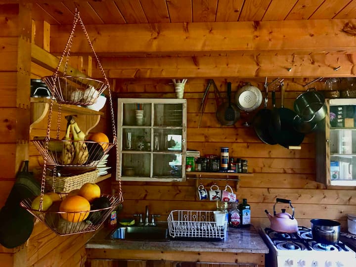 Die zweistöckige Hütte verfügt über ein Wohnzimmer, eine Küche und ein Badezimmer im ersten Stock und ein Schlafhochbett im zweiten Stock und es gibt ein Sofa im Erdgeschoss. Neu gebaute Außendusche mit schwerkraftgefütterter Regenwasserfass erstaunliche Dusche im Wald und ein Holzofen für Wärme, wenn es kalt ist. Das Sonnenlicht erfüllt die Hütte mit der reichen Farbe der Holzstämme und die Domdecke fühlt sich wirklich wie die Natur selbst an, die sie umgibt!
