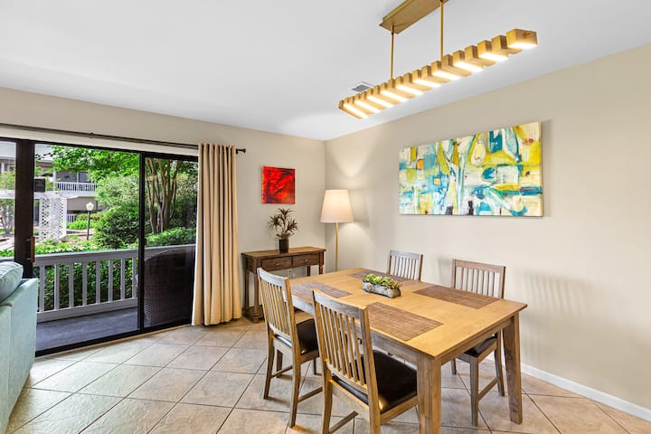 Eingebettet in die ruhige, parkähnliche Umgebung der Beachwood Villas ist die Beachwood Villa 7E ein wunderschön renovierter Rückzugsort im Erdgeschoss, der für mühelosen Küstenkomfort konzipiert wurde. Die Aufteilung mit einem Schlafzimmer und einem Badezimmer ist ideal für Paare oder kleine Familien und bietet Platz für bis zu vier Gäste mit einem Kingsize-Bett und einem Queensize-Schlafsofa. Das einladende offene Design kombiniert entspannte Eleganz mit einer beruhigenden, vom Strand inspirierten Palette und schafft einen hellen und luftigen Rückzugsort. Die aktualisierte Küche verfügt über Granit-Arbeitsplatten, strahlend weiße Schränke und Edelstahlgeräte – perfekt für die Zubereitung von Mahlzeiten nach einem Tag am Strand. Genieße ein ruhiges Frühstück an der Bar oder versammle dich am Esstisch für ein gemütliches Abendessen. Der gemütliche Wohnbereich bietet einen bequemen Ort, um sich bei einem Film zu entspannen, während sich die Glasschiebetüren zu Ihrer privaten überdachten Terrasse öffnen, die von tropischem Grün umgeben ist. Das Schlafzimmer ist eine ruhige Oase mit einem Kingsize-Bett und einem Flachbildfernseher, und das fröhliche Bad mit einer Badewanne/Duschkombination bietet einen erfrischenden Ort, um das Salz und die Sonne des Tages abzuspülen.